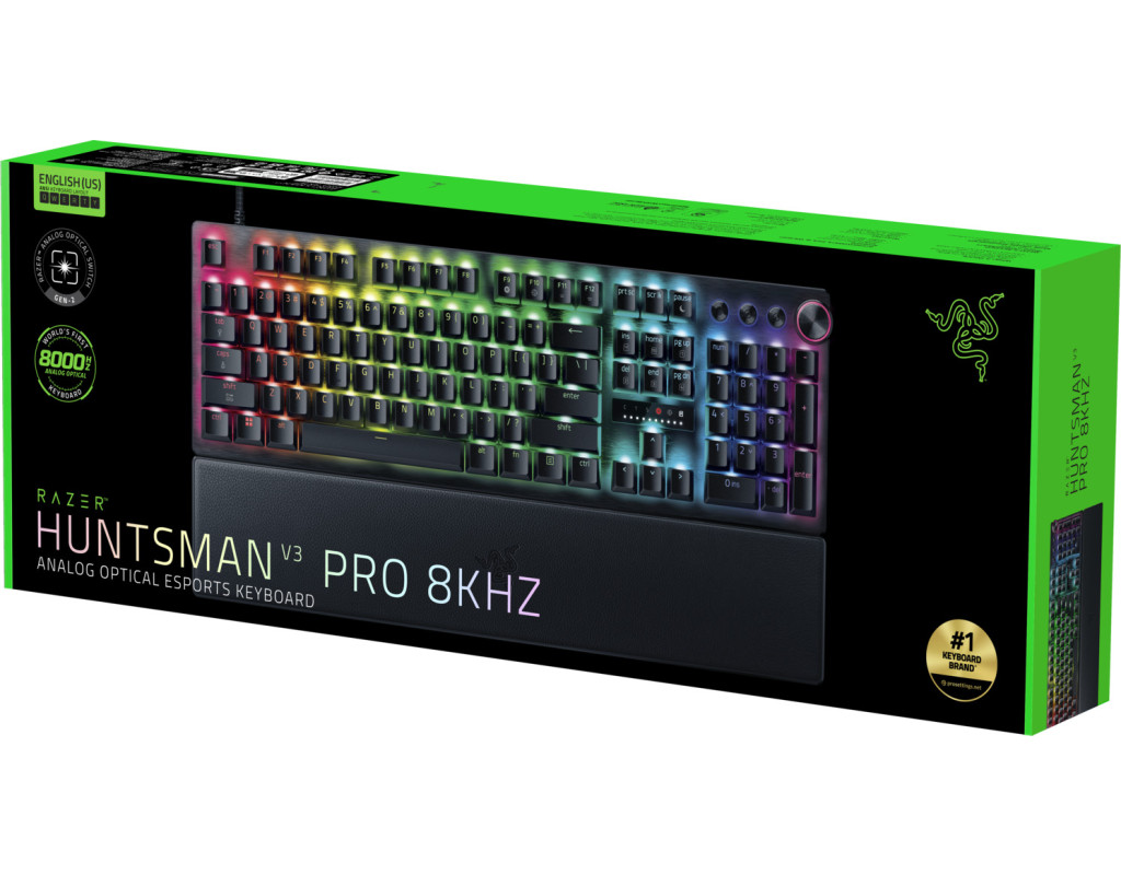 Проривайтеся крізь конкуренцію з нашою найшвидшою аналоговою оптичною клавіатурою з мінімальною затримкою введення, створеною спільно з професіоналами та для професіоналів. Оснащена HyperPolling 8000 Гц, Razer Snap Tap, режимом Rapid Trigger і регульованою точкою спрацювання, вона дозволяє грати на рівні найкращих у світі — з обладнанням, що відповідає їхнім найвищим вимогам. Справжні 8000 Гц HyperPolling Майже нульова затримка Отримайте вирішальну частку секунди переваги завдяки частоті опитування, що у 8 разів перевищує галузевий стандарт. Ця ігрова клавіатура забезпечує надшвидку передачу сигналу, дозволяючи виконувати кожну дію без відчутних затримок. Перевірені на практиці аналогові оптичні перемикачі Razer Gen-2 у поєднанні зі справжньою технологією HyperPolling 8000 Гц демонструють продуктивність, що на 11% швидша за найближчого конкурента, досягаючи затримки лише 0,58 мс — для практично миттєвої реєстрації натискань. Тестування проводилося за 20 вимірами з точкою спрацювання 0,1 мм і частотою опитування 8000 Гц. Відсоток округлено до цілого значення. Затримка вимірюється від моменту спрацювання перемикача до отримання сигналу USB-портом хост-пристрою. Наскрізна затримка може відрізнятися залежно від тестового середовища та використовуваних пристроїв. Аналогові оптичні перемикачі RAZER Gen-2 Rapid Trigger та регульована точка спрацювання Отримайте максимальну точність і швидкодію з перемикачами нового покоління, які підтримують Rapid Trigger для надшвидких повторних натискань, регульований діапазон спрацювання від 0,1 до 4,0 мм та ресурс до 100 мільйонів натискань. Режим Rapid Trigger Замість фіксованої точки скидання клавіша реєструється повторно одразу під час зворотного руху — вже з 0,1 мм. Це дозволяє виконувати значно швидші повторні натискання порівняно зі стандартними клавіатурами та суттєво підвищує швидкість реакції в іграх. Razer Snap Tap Функція надає пріоритет останньому введенню між двома обраними клавішами без необхідності відпускати попередню. Це забезпечує швидші та точніші зміни напрямку руху. Snap Tap вимкнено за замовчуванням і може бути увімкнено або вимкнено через Razer Synapse чи комбінацією FN + Left Shift. Регульована точка спрацювання Підтримка повного діапазону від 0,1 до 4,0 мм дозволяє налаштувати перемикачі відповідно до бажаної чутливості та підібрати параметри під власний стиль гри. Сила натискання 40 г Менше зусилля для спрацювання забезпечує швидшу реакцію та точніше керування — від контр-стрейфінгу й прицілювання до ухилянь. Отримайте ту саму частку секунди, що вирішує результат кожного ігрового епізоду. Точність і стабільність спрацювання Відкалібровані на заводі за найвищими стандартами, аналогові оптичні перемикачі Razer Gen-2 демонструють приблизно у 2,5 раза кращий контроль верхньої зони ходу порівняно з найближчим конкурентом, забезпечуючи реальну точність 0,1 мм. У корпусі Huntsman V3 Pro перемикачі повністю захищені від зовнішнього світла та стійкі до металевих і магнітних перешкод, що гарантує стабільну та точну роботу по всьому діапазону ходу 0,1–4,0 мм. Швидкі апаратні налаштування За допомогою LED-індикатора Точно змінюйте висоту точки спрацювання або чутливість Rapid Trigger безпосередньо під час гри, використовуючи візуальну індикацію LED-масиву. Усі налаштування зберігаються у пам’яті клавіатури без потреби в програмному забезпеченні. Комбінації клавіш: •FN +