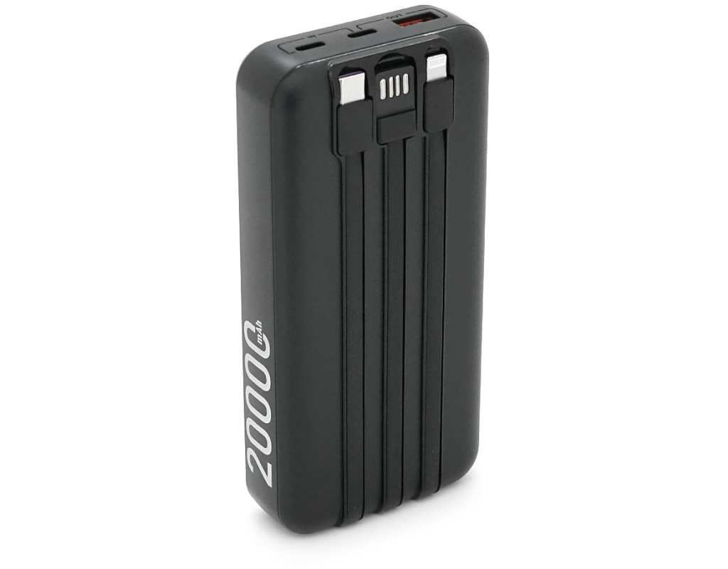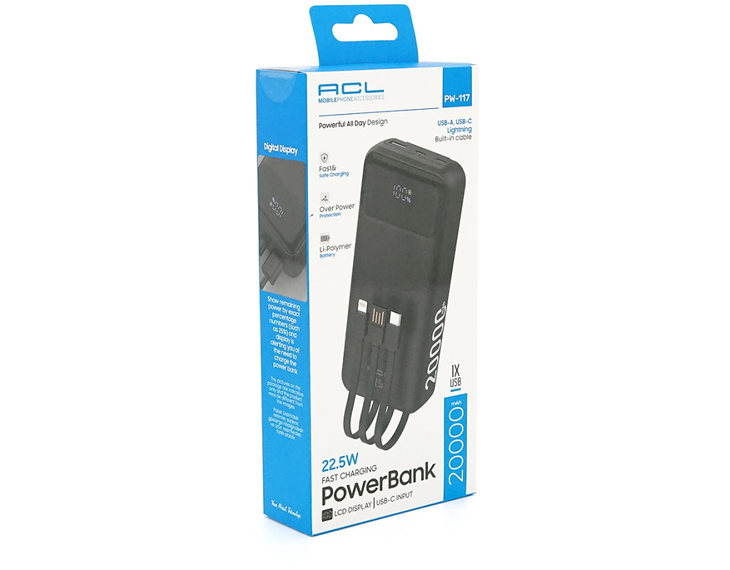 Powerbank ACL PW-117 20000mAh, PD22.5W, 1xUSB+2xUSB-C, 3 кабелі (USBType-C / Lighting), 0.47кг, Black / White, Box