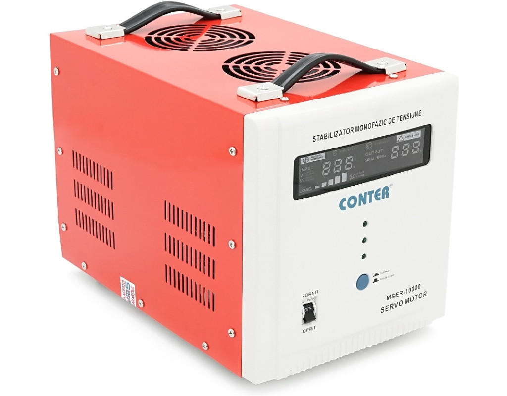 Однофазний стабілізатор напруги Conter MSER 10000 - сучасний пристрій із сервопривідним механізмом, призначений для точної стабілізації напруги та комплексного захисту підключеного електроустаткування. Модель розроблена для роботи в умовах нестабільних електромереж та оптимально підходить для побутової техніки, електроніки, офісного та промислового обладнання. В основі роботи стабілізатора використовується високоточний серводвигун, що плавно регулює положення автотрансформатора. Завдяки цьому вихідна напруга підтримується в заданих межах без різких стрибків, що особливо важливо для чутливих приладів. Принцип роботи Ключові особливості