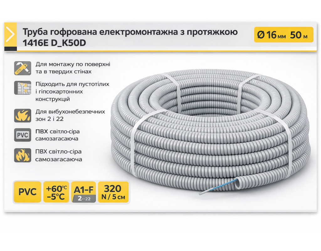 | Гофрована електромонтажна труба з ПВХ із вбудованою протяжкою (зондом), призначена для захисту та прокладання електричних кабелів і проводів. Належить до серії MONOFLEX — гнучкі труби з низькою механічною стійкістю, оптимальні для стандартних внутрішніх електромонтажних робіт. Основні характеристики: • Тип: гофрована труба з протяжкою • Зовнішній діаметр: 16 мм • Матеріал: ПВХ (PVC), самозагасаючий • Колір: світло-сірий • Довжина бухти: 50 м • Стійкість до стискання: 320 N / 5 см • Діапазон робочих температур: від −5 °C до +60 °C • Клас реакції на вогонь: A1–F • Стійкість до впливу полум’я: до 30 секунд • Класифікація вибухонебезпечних зон: зона 2 та зона 22 Монтаж та застосування: • Для монтажу по поверхні та в твердих стінах • Підходить для встановлення в порожнисті стіни, гіпсокартонні конструкції та дерев’яні основи • Дозволена установка в приміщеннях з можливістю вибуху горючих газів і парів (зона 2) • Дозволена установка в приміщеннях з можливістю вибуху горючого пилу (зона 22) Призначення: Використовується в житлових, комерційних та промислових приміщеннях для прокладання силових і слаботочних кабельних мереж, забезпечує базовий механічний захист та зручність монтажу завдяки протяжці. |
