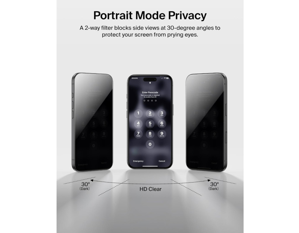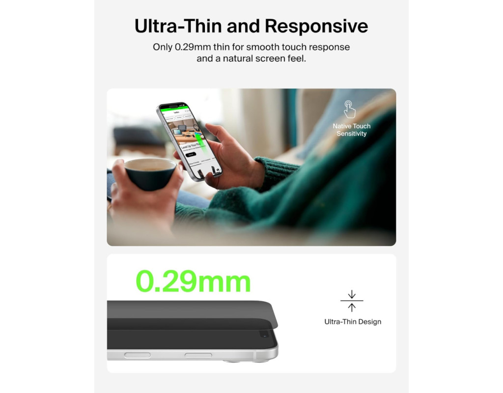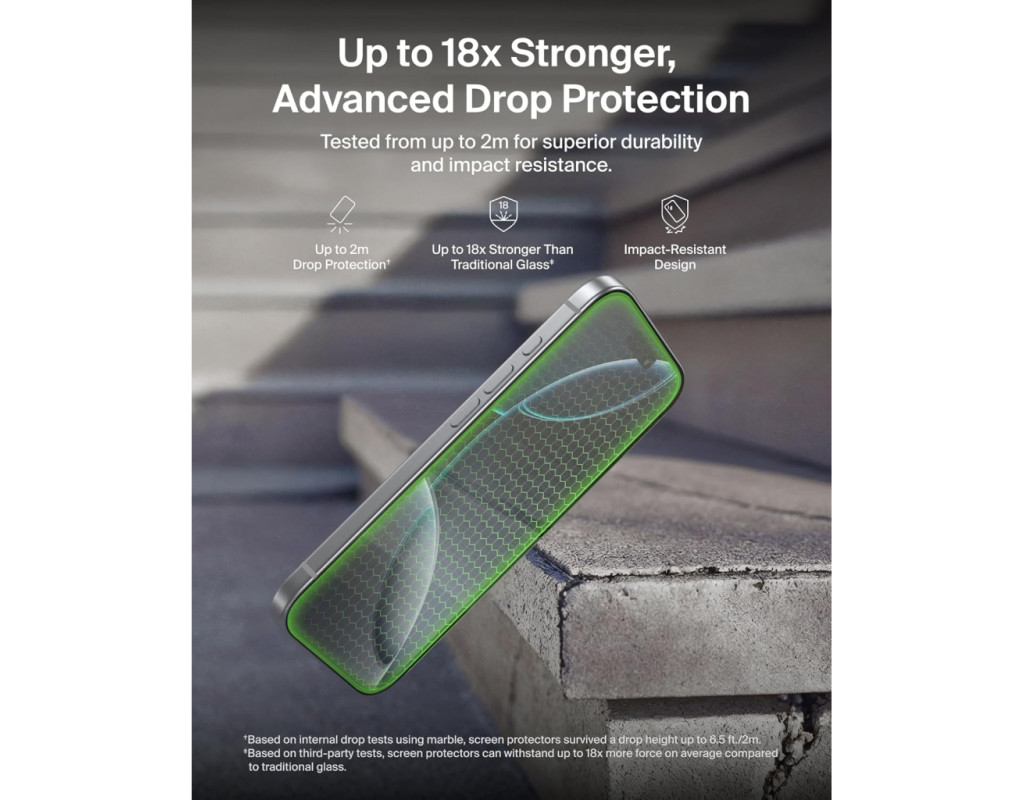 | Захисне скло Belkin Privacy TemperedGlass для iPhone 17 Pro забезпечує повноекранний захист з ефектом приватності. Міцність у 18 разів вища за звичайне скло завдяки InvisiGlass™, витримує падіння з 2 м і має твердість 9H. Товщина 0,29 мм зберігає чутливість сенсора, а антимікробне покриття зменшує відбитки. Виготовлено з 60% переробленого скла. |