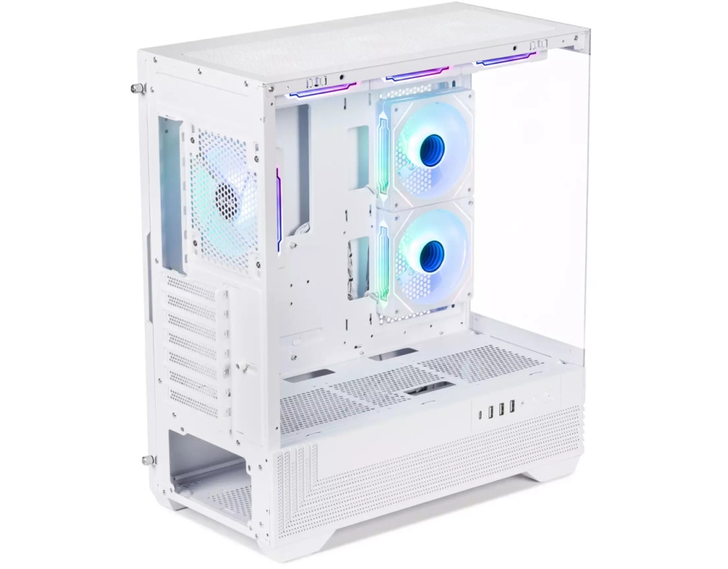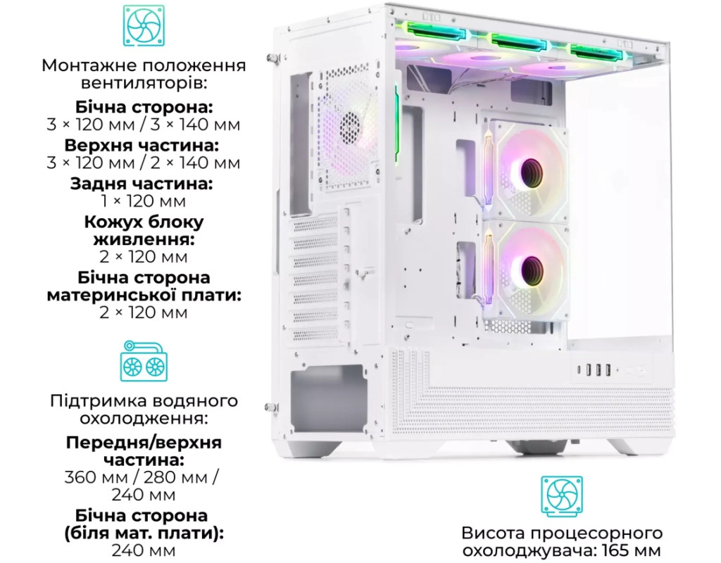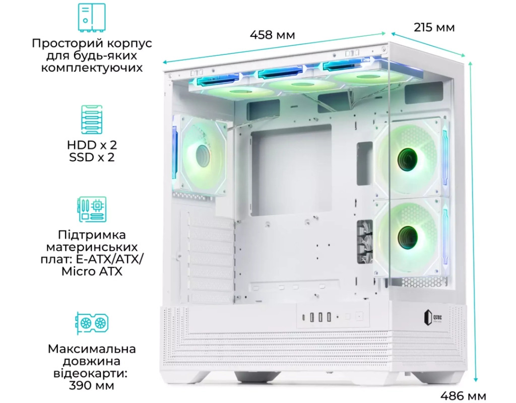 | Корпус QUBE FORT ARGB White (FORT_GWNU3) - це стильне і функціональне рішення для складання потужного комп'ютера, що поєднує вишуканий білий дизайн і продуману ергономіку. Завдяки бічній панелі із загартованого скла можна милуватися роботою підсвічування і внутрішніми компонентами системи. До комплекту входять шість 120-міліметрових ARGB/PWM вентиляторів з ефектом «нескінченного дзеркала», що створюють не тільки ефектне візуальне оформлення, а й забезпечують ефективне охолодження. Контролер і пульт дають змогу налаштовувати кольори та режими підсвітки, надаючи системі індивідуального стилю. QUBE FORT ARGB White підтримує встановлення материнських плат форматів E-ATX, ATX і mATX, а також відеокарт завдовжки до 390 мм і процесорних кулерів заввишки до 165 мм. Це дає можливість зібрати продуктивну систему з будь-якими сучасними комплектуючими. Для ентузіастів передбачена підтримка рідинного охолодження - радіатори до 360 мм можна встановити спереду і зверху, а збоку розміщується варіант до 240 мм. Такий підхід гарантує оптимальну температуру навіть за високих навантажень. Корпус вирізняється високим рівнем практичності: на передній панелі розташовані зручні роз'єми - USB Type-C, USB 3.0, два USB 2.0 і аудіовихід. Для організації сховища даних передбачено два відсіки під 3.5« і два під 2.5» накопичувача, що дає змогу комбінувати жорсткі диски та SSD. Продумана система кабель-менеджменту забезпечує акуратну збірку без зайвих дротів, а сталевий каркас завтовшки 0.7 мм гарантує міцність і довговічність конструкції. Розміри корпусу становлять 458×215×486 мм, що робить QUBE FORT ARGB White містким, але водночас досить компактним для встановлення на робочому столі. Біла колірна схема надає йому легкості та візуальної елегантності, підкреслюючи стильну збірку. |