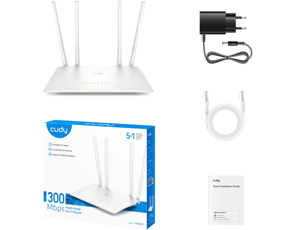 | Маршрутизатор Cudy WR300S, Wi-Fi, 802.11b/g/n, 300Mbps 2.4GHz, 5×10/100Mbps, 4×5dBi an, WiFi, IPv6 |