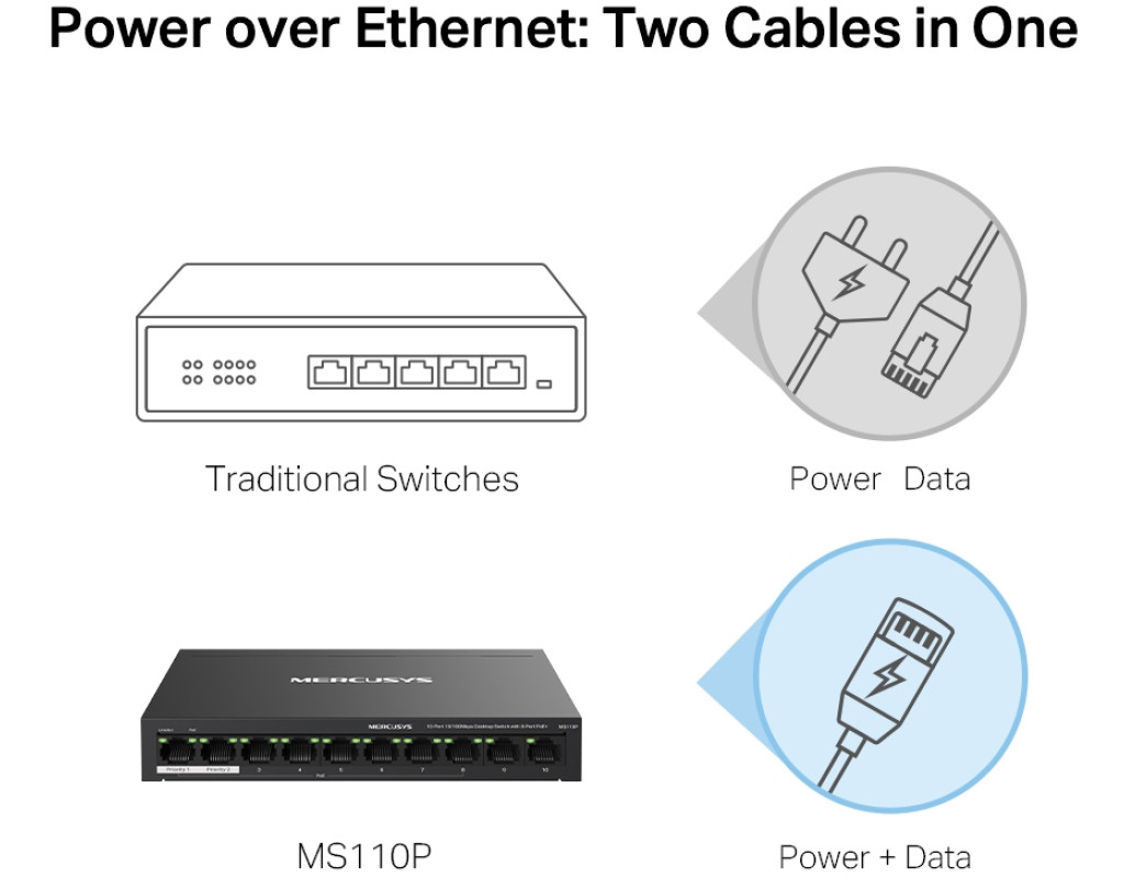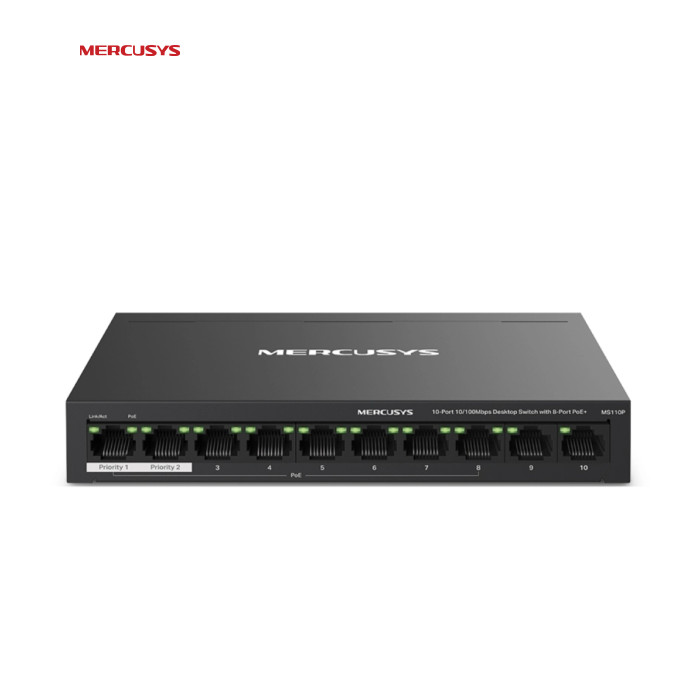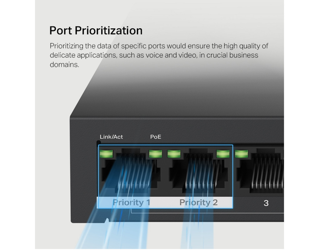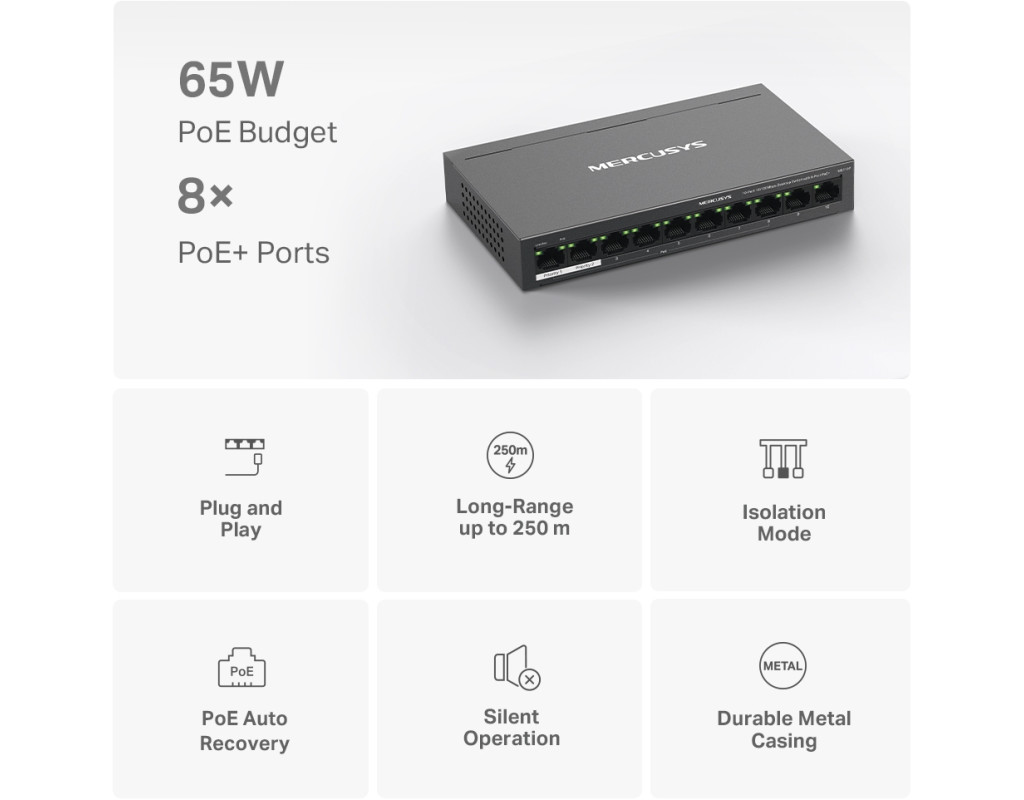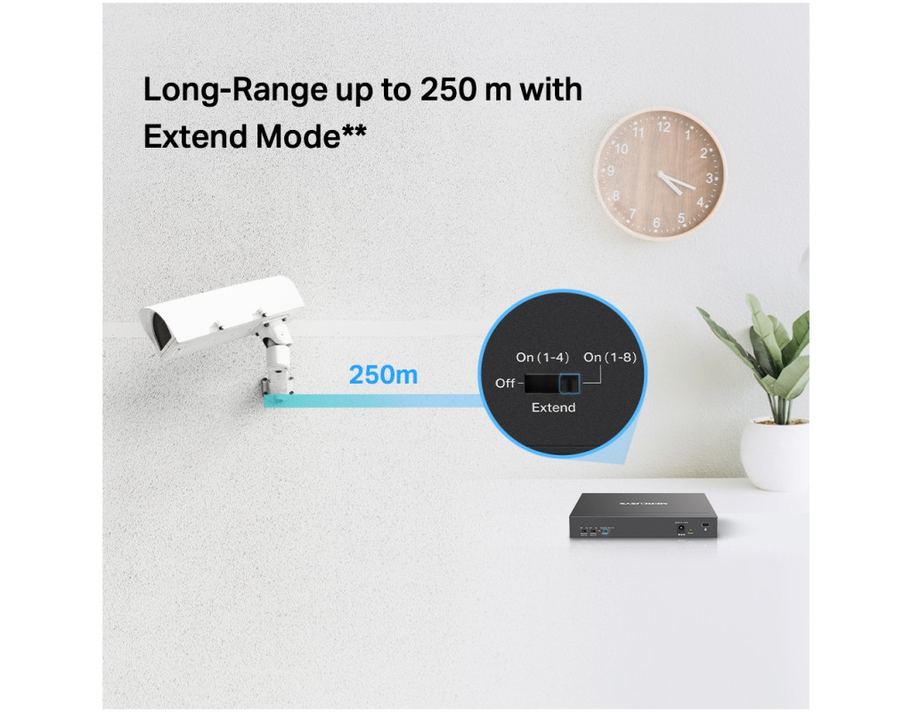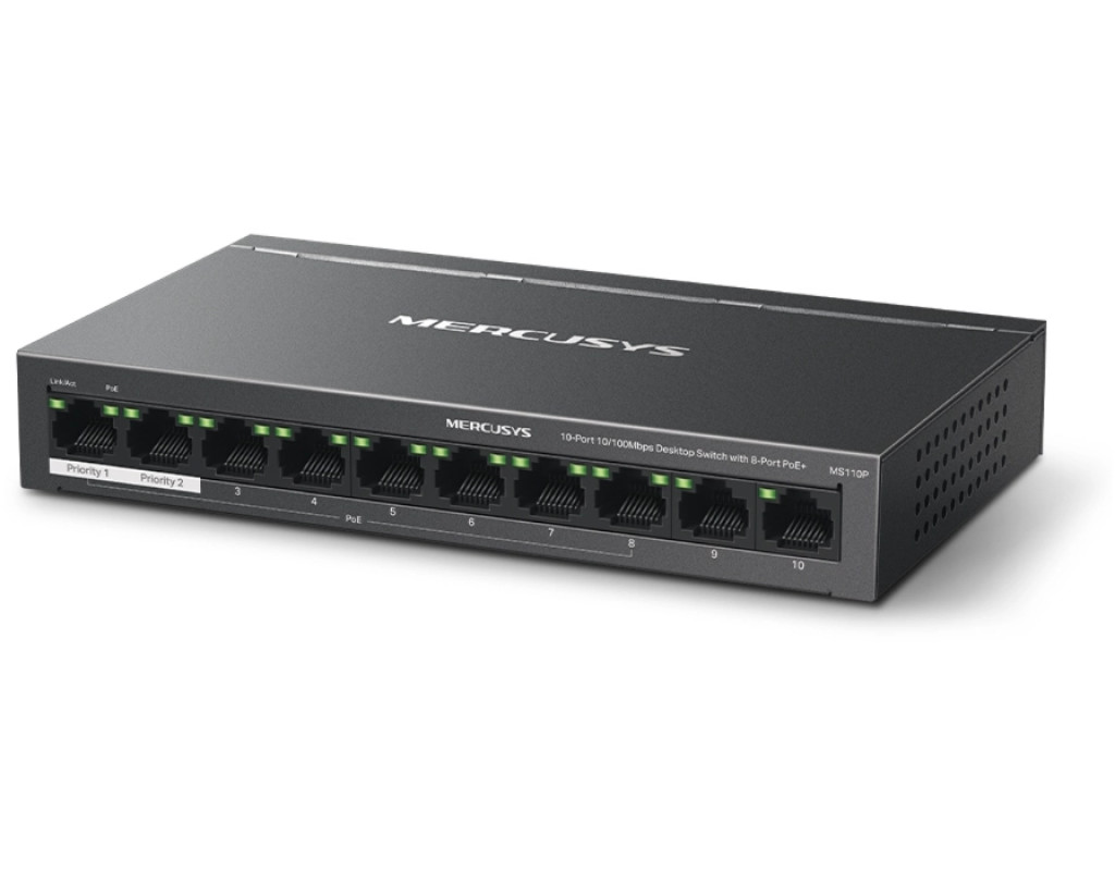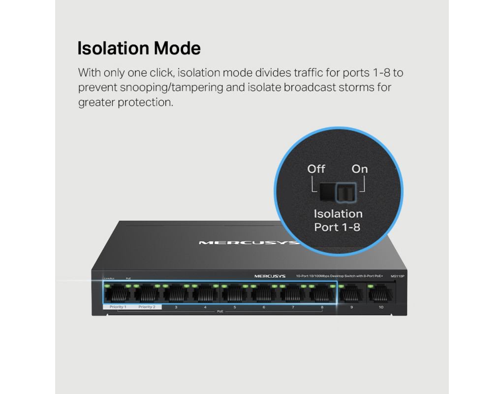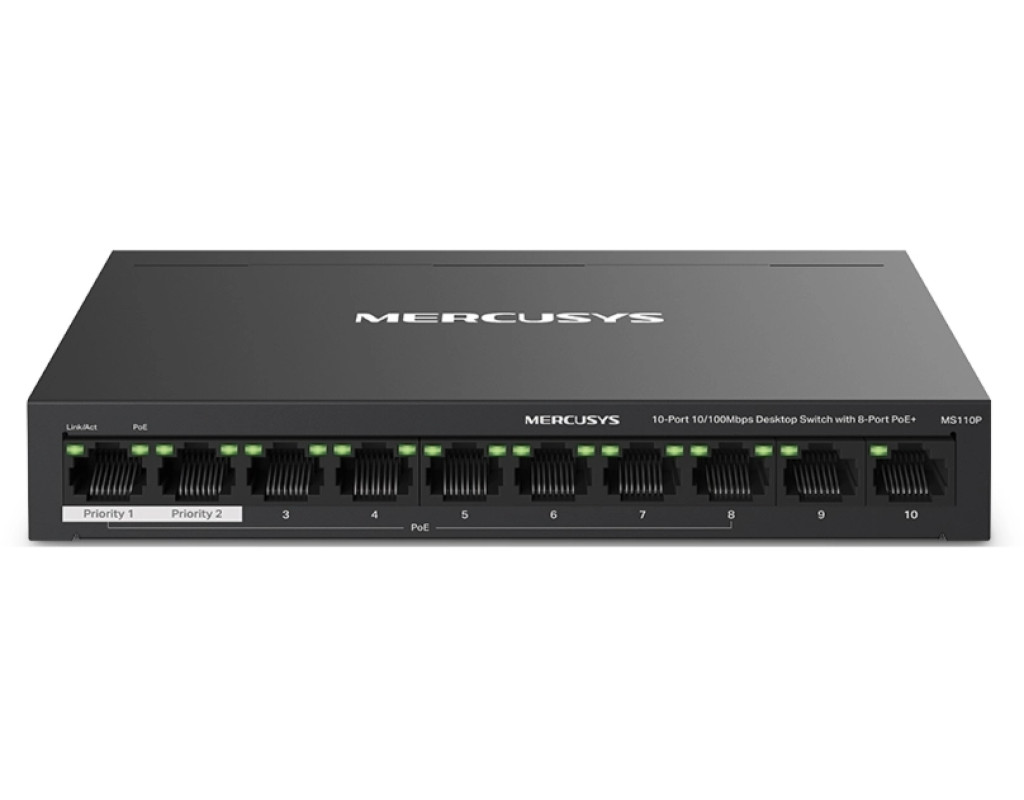 | Вісім портів PoE+ із загальним бюджетом 65 Вт Порти 1–8 комутатора підтримують технологію PoE+, бюджет кожного такого порту становить 30 Вт. Такі порти дозволяють подавати живлення до пристроїв стандартів 802.3af/at. Пристрій має два порти Uplink без підтримки PoE: один — для підключення до інтернету, а інший — для підключення до мережного відеореєстратора. Вісім портів PoE+ із загальним бюджетом PoE 65 Вт знадобляться в різних сценаріях. Наприклад, при розгортанні системи відеоспостереження в офісах та гуртожитках. Технологія PoE дозволяє подавати живлення на точки доступу, IP-телефони, комп'ютери, відеореєстратори та ряд інших пристроїв. Максимальна дальність Режим збільшення дальності дозволить збільшити відстань роботи PoE до 250 метрів. Цей режим підтримується кожним із восьми портів MS110P з підтримкою PoE+. Режим збільшення дальності ідеально підійде для розгортання системи відеоспостереження на великій площі. Розподіл трафіку Режим ізоляції дозволяє одним натисканням розділити трафік портів 1–8 для захисту від прослуховування та втручань, а також для ізолювання широкомовних штормів. Також MS110P має два порти Uplink, необхідні при включенні режиму ізоляції. Пріоритизація портів Можливість пріорітизації конкретних портів дозволить гарантувати якість роботи програм, чутливих до затримок трафіку, наприклад, голосових та відео додатків. Автовідновлення Комутатор постійно відстежує процес обміну даними з пристроями, що живляться по PoE. Якщо пристрій не буде надсилати пакети з даними на комутатор протягом тривалого періоду часу, комутатор автоматично перезавантажить такий пристрій. Автоналаштування MS110P підтримує автоматичне узгодження швидкості (10/100/1000 Мбіт/с) та автоматичне визначення типу кабелю (MDI/MDIX). Комутатор не вимагає додаткового налаштування, що дозволяє заощадити час та сили. Міцний та тихий Довговічний металевий корпус MS110P забезпечує ефективне розсіювання тепла, захист від перешкод, стабільну роботу та тривалий термін служби. |