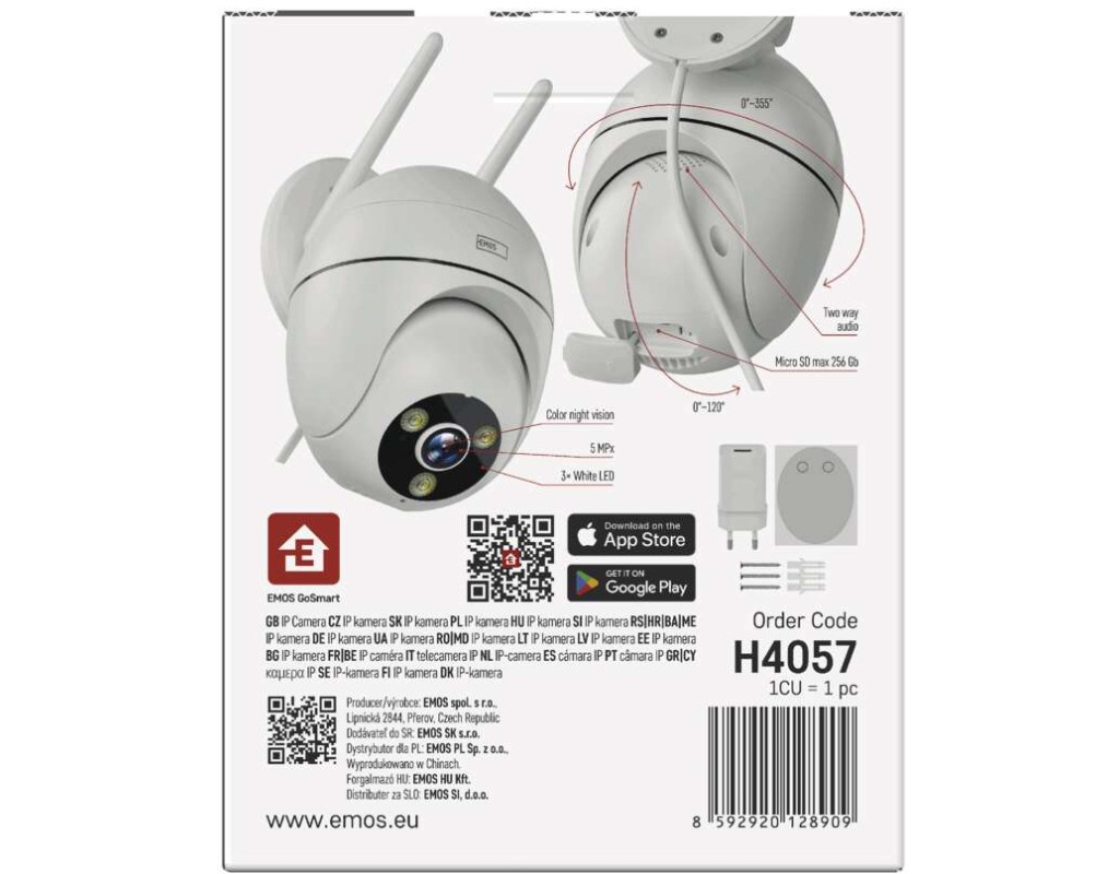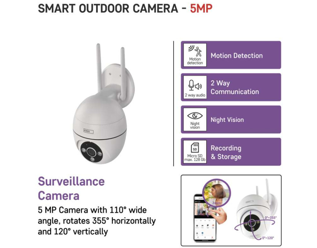 • роздільна здатність камери 5 Мп для чудової чіткості зображення• функція PTZ (поворот навколо осі та масштабування) – панорамування та масштабування камери за потреби для повного охоплення області спостереження• сирена та відбивач для ще кращої системи захисту• якісна безпека зони спостереження• функція відстеження руху, коли камера обертається за відстежуваним об'єктом• інші функції: двосторонній голосовий зв'язок, кольорове нічне бачення, виявлення руху та звуку, IP65• Протокол: Wi-Fi• сумісний з EMOS GoSmart, TUYA, LIDL, SmartLife, відкритою системою• мобільний додаток EMOS GoSmart повністю безкоштовний та доступний більш ніж 60 мовами• керується голосовими помічниками Google Assistant та Amazon Alexa |