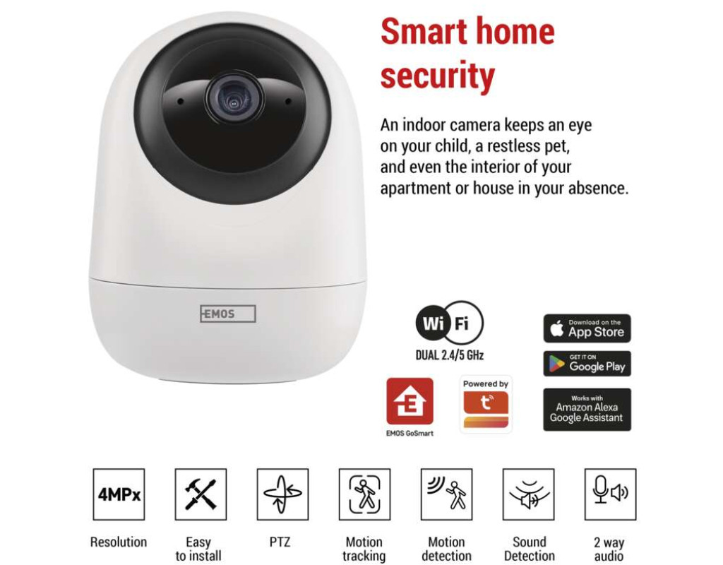 Розумна камера з двома діапазонами - Wi-Fi 2.4 та 5 ГГцПоворотна камера IP-220W забезпечить безпеку вашого дому чи офісу. Вона оснащена роздільною здатністю 4 Мп та має інтелектуальні функції, такі як PTZ, виявлення руху, виявлення звуку, має вбудований динамік та мікрофон. Завдяки сповіщенням на ваш мобільний пристрій ви зможете відстежувати, що відбувається вдома, будь-коли та будь-де, а відеозапис зберігається на SD-карті або в хмарі. Функція DUALBAND - Wi-Fi 2.4 та 5 ГГц гарантує, що у вас більше не буде проблем із підключенням до мережі Wi-Fi. Елегантний дизайн, сумісний розмір та гнучке розміщення - все це гарантує, що камера впишеться в будь-який інтер'єр.• DUALBAND – сумісний з Wi-Fi 2.4 та 5 ГГц• роздільна здатність камери 4 Мп для чудової чіткості зображення• функція PTZ (панорамування та масштабування за двома осями) – панорамування та масштабування камери за потреби для повного охоплення області спостереження• нічний режим та обмеження області перегляду• камеру можна підвісити або встановити• живлення від 2-метрового кабелю USB-C• легке встановлення з повним комплектом аксесуарів• можливість автоматизації з іншими розумними пристроями• сумісний з EMOS GoSmart, TUYA, LIDL, SmartLife, відкритою системою• мобільний додаток для EMOS GoSmart повністю безкоштовний та доступний більш ніж 60 мовами• керується голосовими помічниками Google Assistant та Amazon AlexaСкористайтеся перевагами всебічного відстеження для повного покриття, гнучкого відстеження та керування безпекою в режимі реального часу, щоб не пропустити жодної миші.