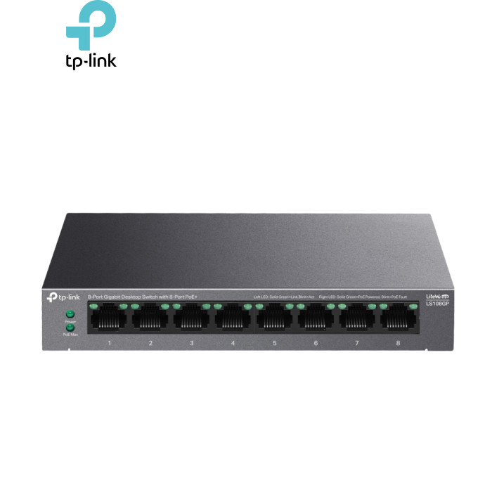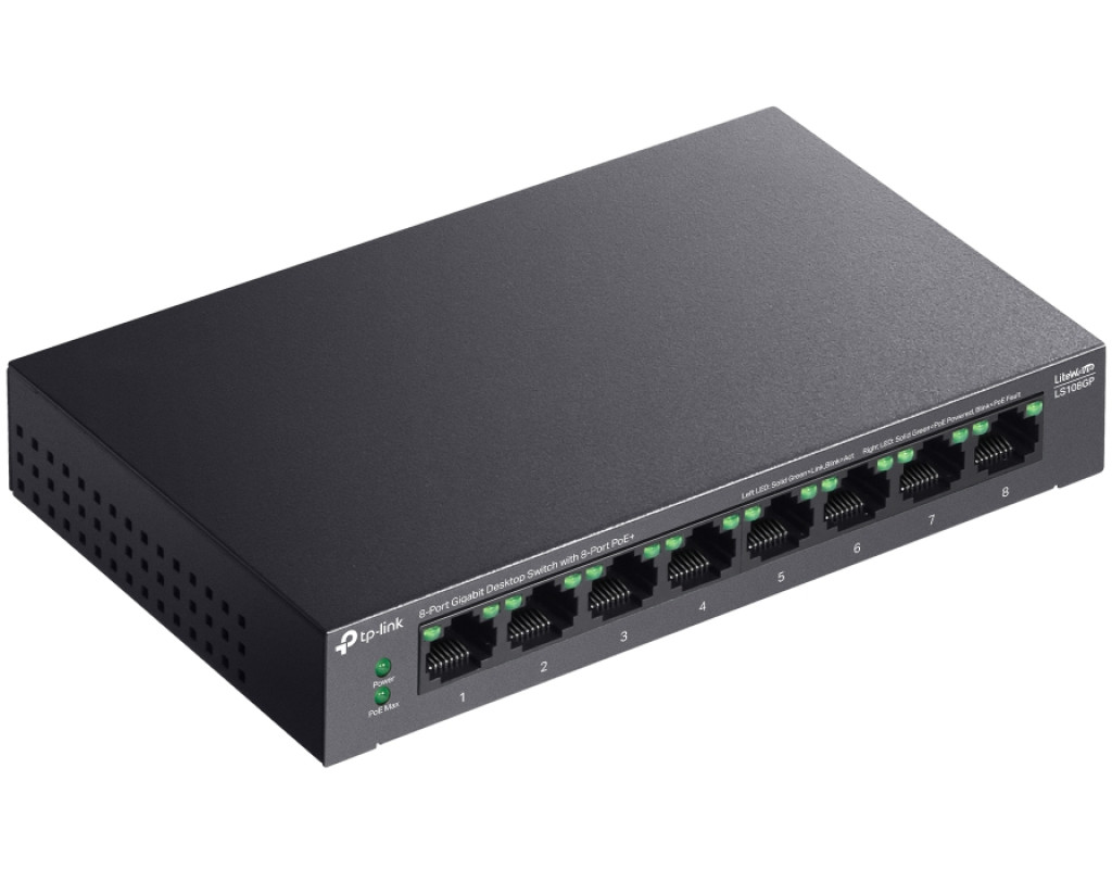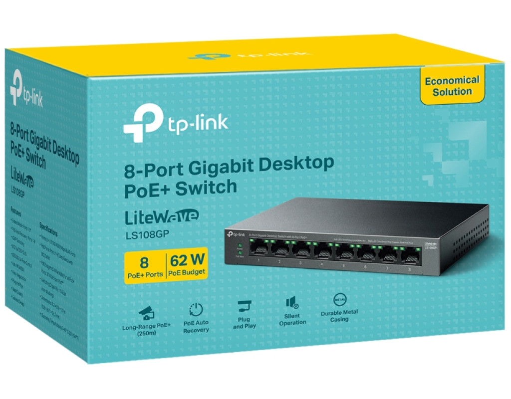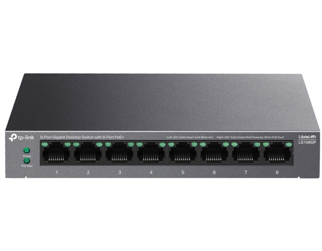 | TP-LINK LS108GP – 8-портовий гігабітний некерований комутатор з підтримкою PoE+ на всіх портах. Має загальний бюджет живлення 62 Вт та до 30 Вт на порт, що дозволяє підключати IP-камери, точки доступу та інші пристрої. Підтримує режим розширення для передачі PoE на відстань до 250 м. |