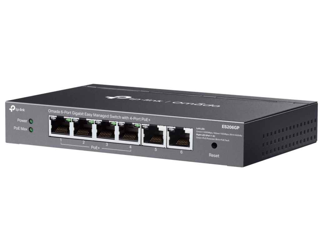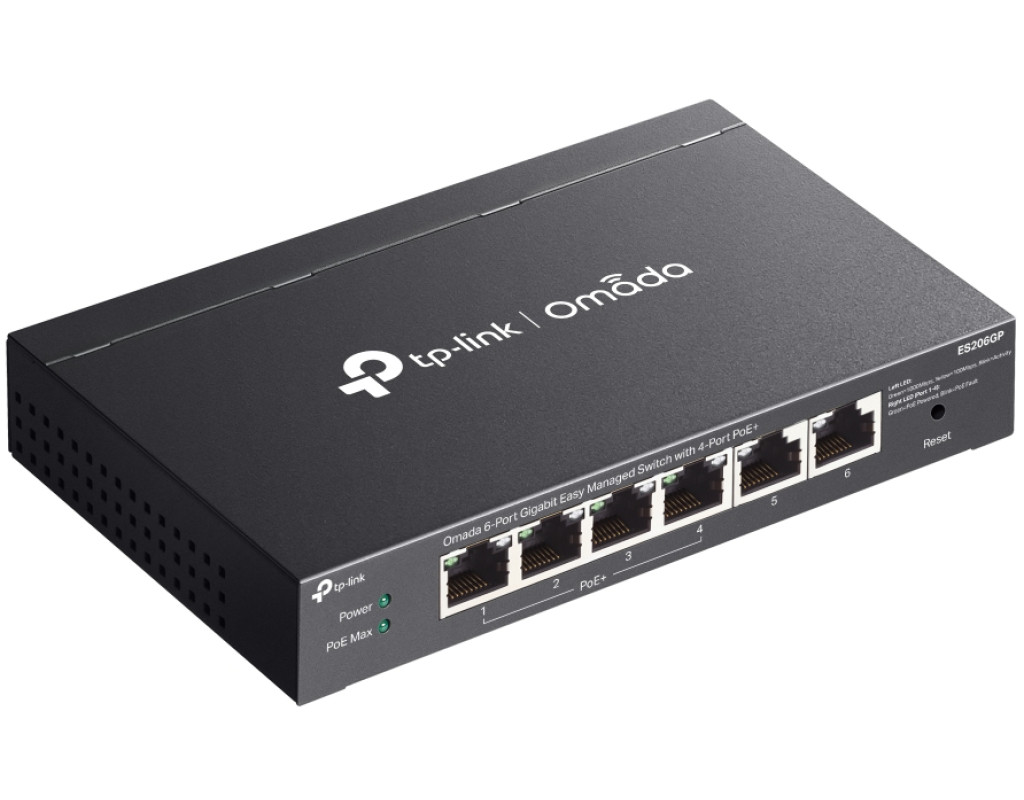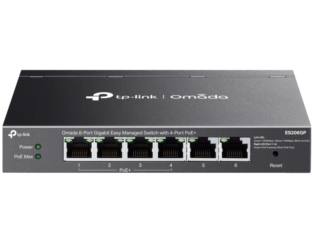 | TP-LINK ES206GP – це 6-портовий гігабітний WebSmart-комутатор із 4 портами PoE+ (802.3af/at) та бюджетом потужності 65 Вт. Підтримує QoS, VLAN, IGMP Snooping, автоматичне відновлення PoE та централізоване керування через хмару Omada. |