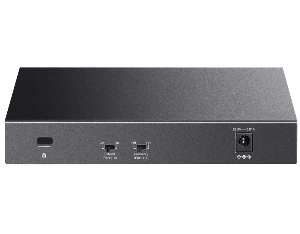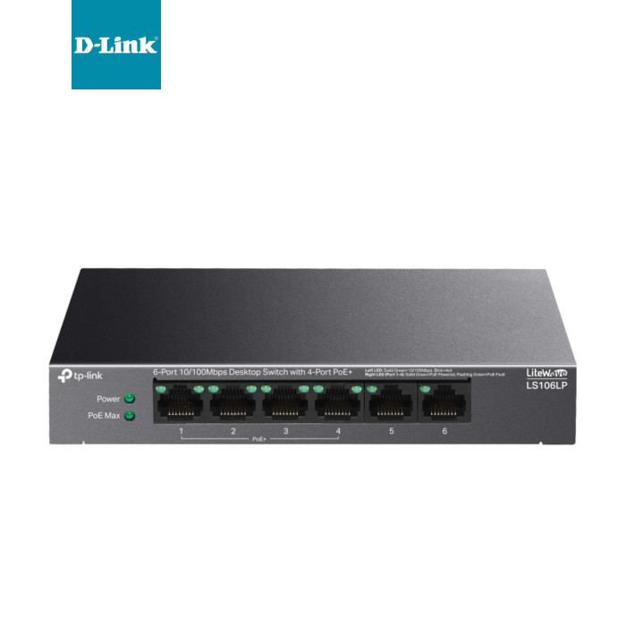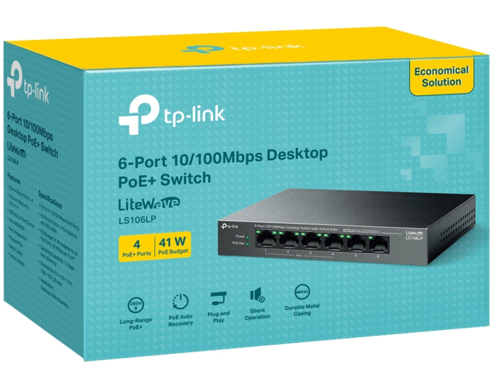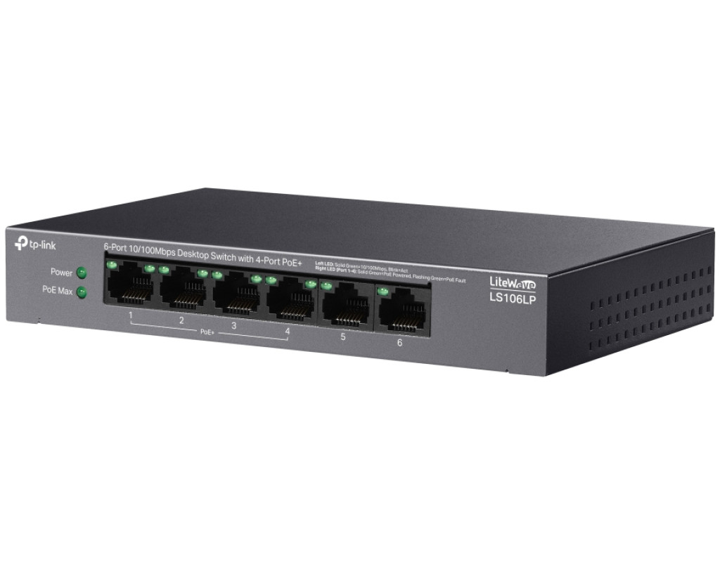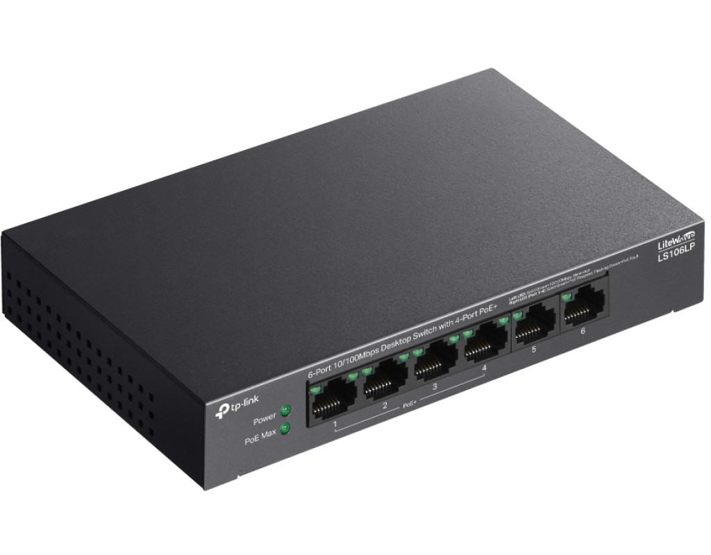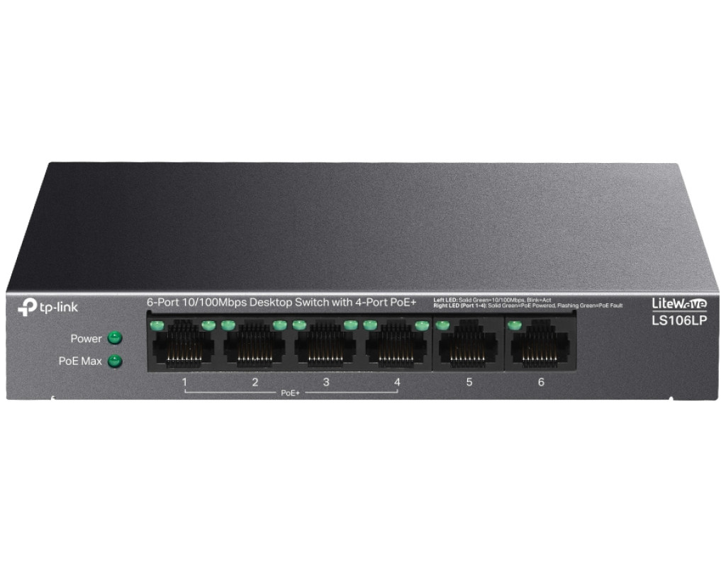 | TP-LINK LS106LP – 6-портовий некерований комутатор Fast Ethernet із 4 портами PoE+ (802.3af/at). Забезпечує загальний бюджет живлення 41 Вт і до 30 Вт на порт. Підтримує режим розширення з передачею даних і живленням на відстань до 250 м. |