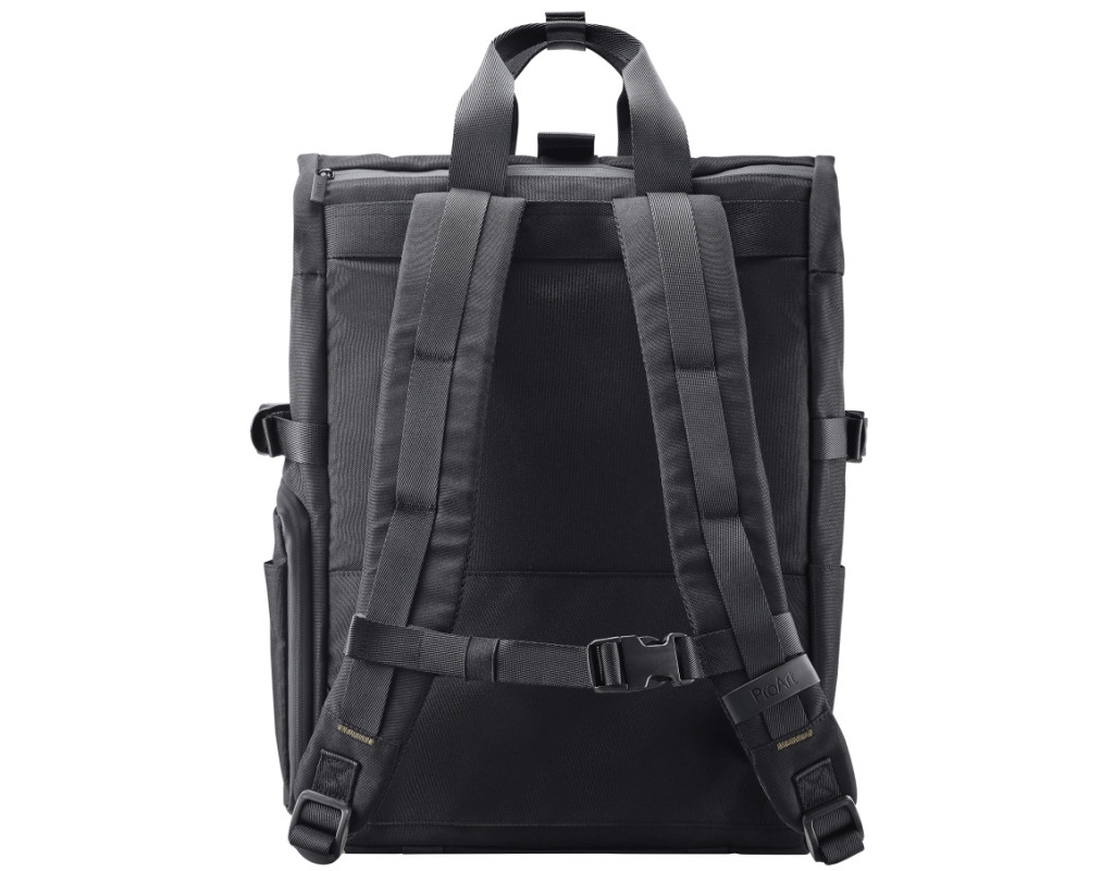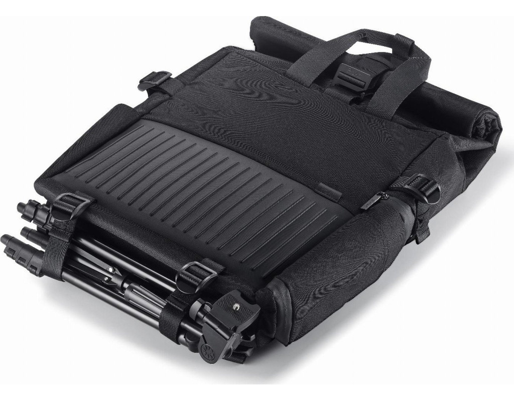 Для зберігання пляшок, парасольок або штативів передбачені функціональні ремені збоку та знизу, а регульований нагрудний ремінь знижує навантаження на плечі під час тривалого носіння.