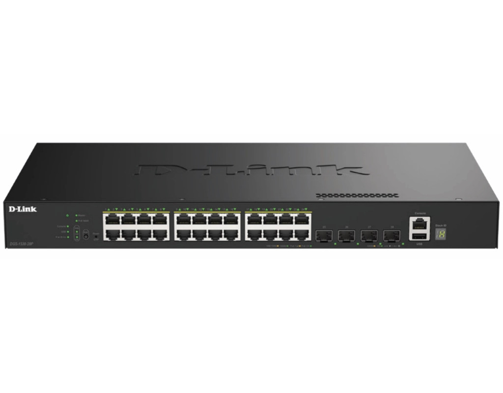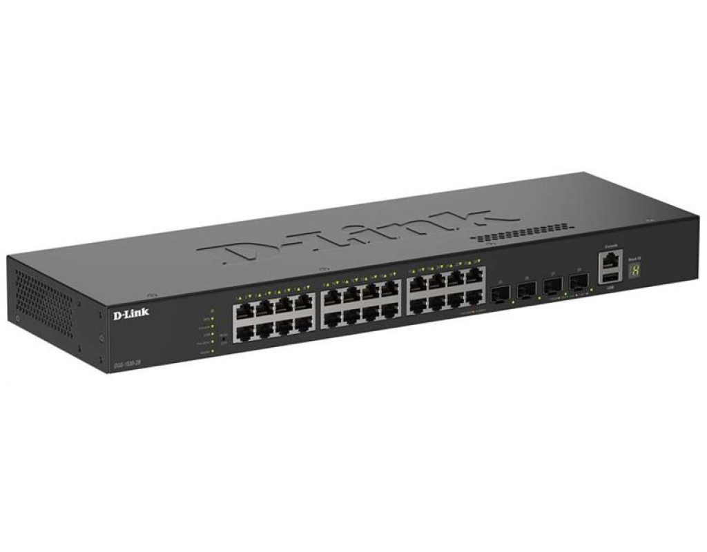 | Потужний L3-керований комутатор D-Link DGS-1530-28 має 24 порти Gigabit Ethernet та 4 порти 10G SFP+ для високошвидкісного з'єднання. Забезпечує продуктивність до 128 Гбіт/с, має підтримку VLAN, ACL, захисту від DDoS, 802.1X, функції SNMP, RMON і інші засоби керування. |