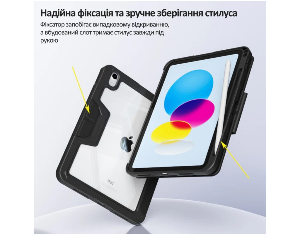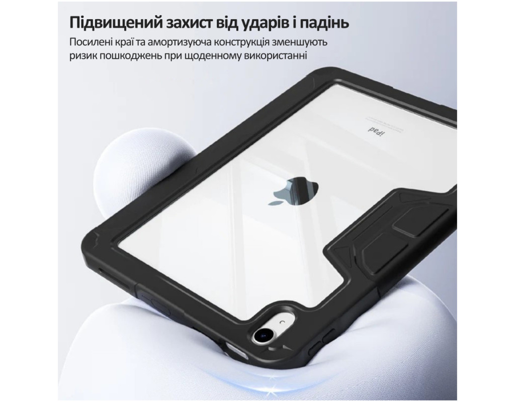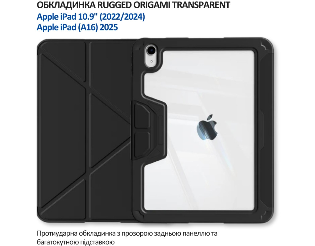 | "Обкладинка BeCover Rugged Origami Transparent з кріпленням Apple Pencil Обкладинка BeCover Rugged Origami Transparent — це надійний захисний чохол для iPad, який поєднує посилений захист, прозору задню панель та зручну складану кришку-підставку у стилі origami. Задня частина чохла виконана з прозорого міцного пластику, який демонструє дизайн вашого iPad і водночас захищає його від подряпин, потертостей та щоденних пошкоджень. Посилена рамка по периметру додає захист кутам і корпусу під час випадкових ударів або падінь. Передня кришка має складану конструкцію Origami, що дозволяє використовувати планшет у кількох положеннях: — для перегляду відео та фільмів, — для роботи з клавіатурою або набору тексту, — для читання та серфінгу в інтернеті. Чохол оснащений кріпленням для Apple Pencil, завдяки чому стилус завжди під рукою та не загубиться під час транспортування. Усі кнопки, роз’єми та камера залишаються повністю доступними — без потреби знімати чохол. Конструкція поєднує захисні властивості rugged-серії з тонким і акуратним виглядом, тому чохол підходить як для дому, так і для роботи чи подорожей. Переваги ⭐: • Посилений захист корпусу та кутів (Rugged-дизайн) • Прозора задня панель — видно оригінальний дизайн iPad • Складана кришка Origami з режимом підставки • Кілька положень для перегляду та роботи • Кріплення для Apple Pencil • Захист екрана у закритому стані • Точні вирізи під камеру, кнопки та роз’єми • Надійна фіксація планшета в чохлі" |