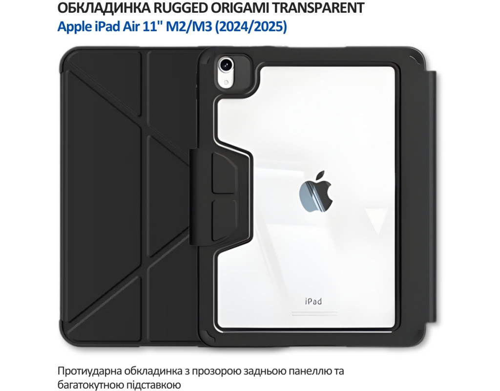 | "Обкладинка BeCover Rugged Origami Transparent з кріпленням Apple Pencil Обкладинка BeCover Rugged Origami Transparent — це надійний захисний чохол для iPad, який поєднує посилений захист, прозору задню панель та зручну складану кришку-підставку у стилі origami. Задня частина чохла виконана з прозорого міцного пластику, який демонструє дизайн вашого iPad і водночас захищає його від подряпин, потертостей та щоденних пошкоджень. Посилена рамка по периметру додає захист кутам і корпусу під час випадкових ударів або падінь. Передня кришка має складану конструкцію Origami, що дозволяє використовувати планшет у кількох положеннях: — для перегляду відео та фільмів, — для роботи з клавіатурою або набору тексту, — для читання та серфінгу в інтернеті. Чохол оснащений кріпленням для Apple Pencil, завдяки чому стилус завжди під рукою та не загубиться під час транспортування. Усі кнопки, роз’єми та камера залишаються повністю доступними — без потреби знімати чохол. Конструкція поєднує захисні властивості rugged-серії з тонким і акуратним виглядом, тому чохол підходить як для дому, так і для роботи чи подорожей. Переваги ⭐: • Посилений захист корпусу та кутів (Rugged-дизайн) • Прозора задня панель — видно оригінальний дизайн iPad • Складана кришка Origami з режимом підставки • Кілька положень для перегляду та роботи • Кріплення для Apple Pencil • Захист екрана у закритому стані • Точні вирізи під камеру, кнопки та роз’єми • Надійна фіксація планшета в чохлі" |