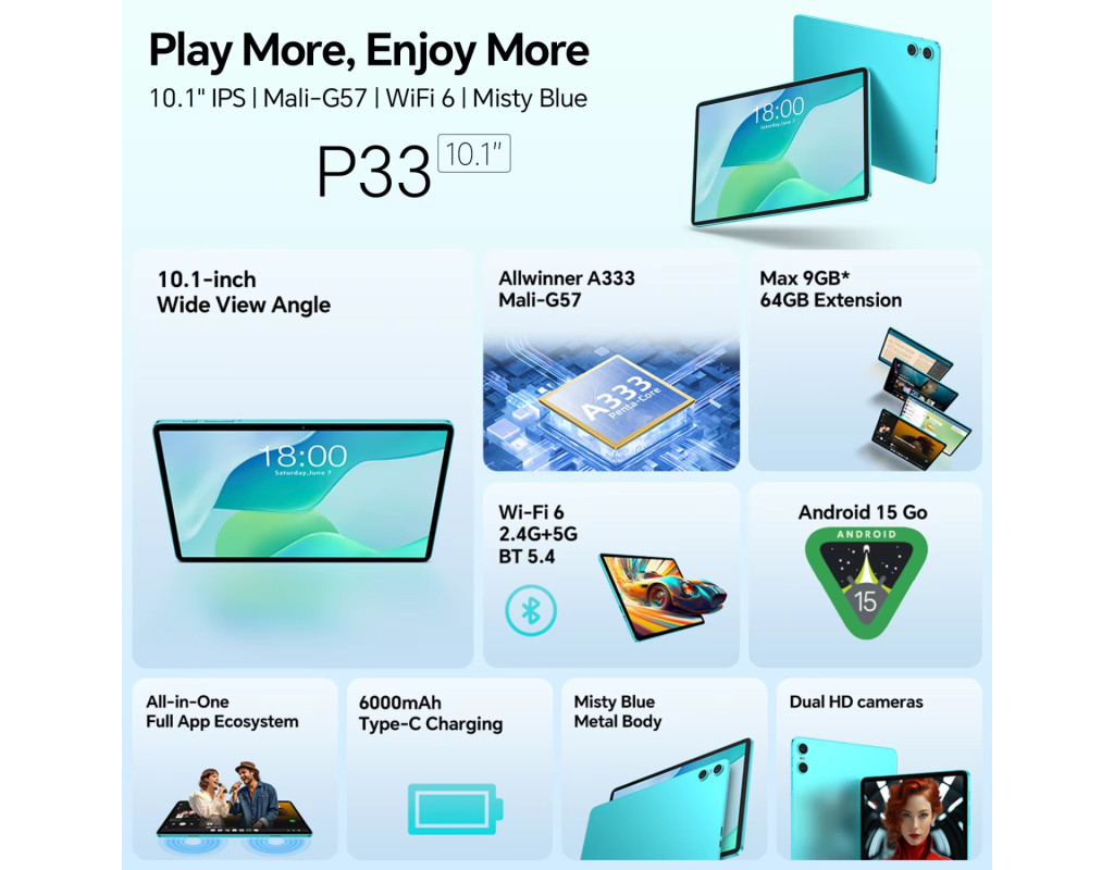 1 х USB C, 1 х mini-Jack (3.5 мм), Andeoid 15, WiFi6, Bluetooth 5.4, датчик освітлення |