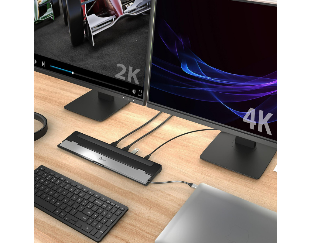 | Ця док-станція надає можливість доєднати два монітори HDMI з підтримкою роздільної здатності до 4K (3840x2160) на одному дисплеї та до 2K (2048x1152) або 1080p на іншому дисплеї. Ви також можете використовувати екран ноутбука як третій дисплей, що полегшує одночасний доступ до декількох програм.