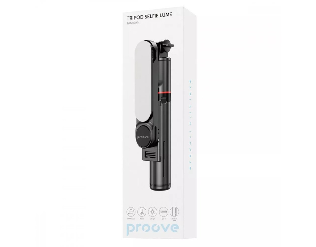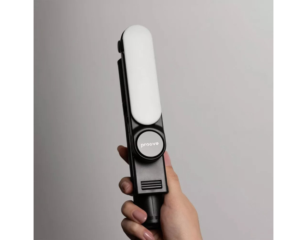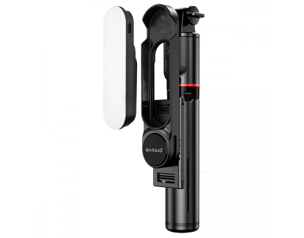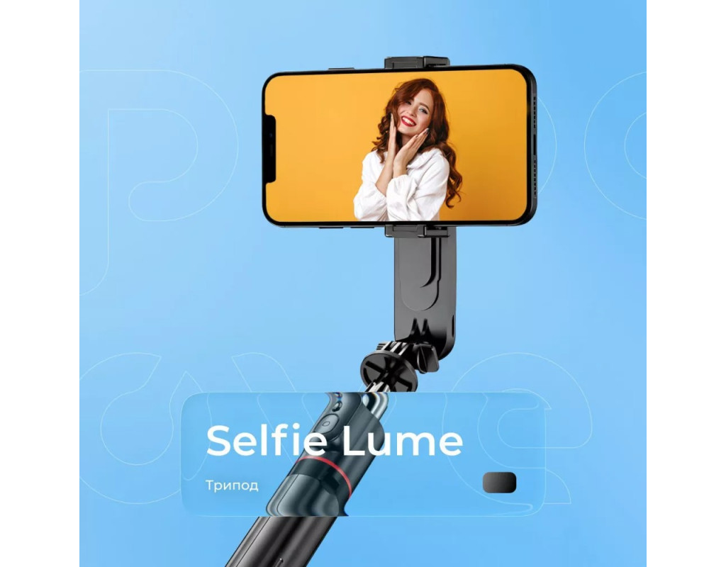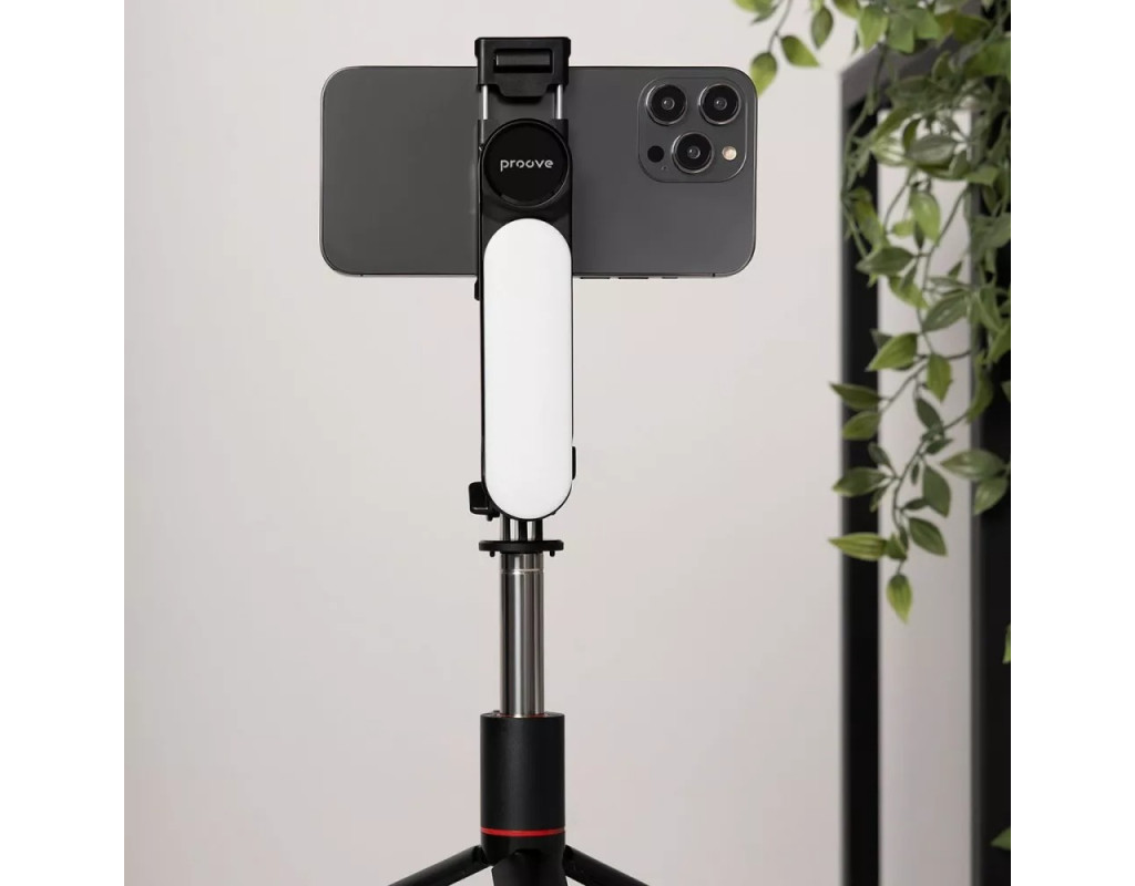 | Трипод оснащений вбудованою LED-підсвіткою, яка забезпечує необхідне освітлення. Телефон надійно фіксується у кріпленні та обертається на 360 градусів, щоб можна було легко змінити кадр, не виймаючи його з конструкції. За потреби можна витягнути бездротовий пульт дистанційного керування та користуватися ним на відстані.