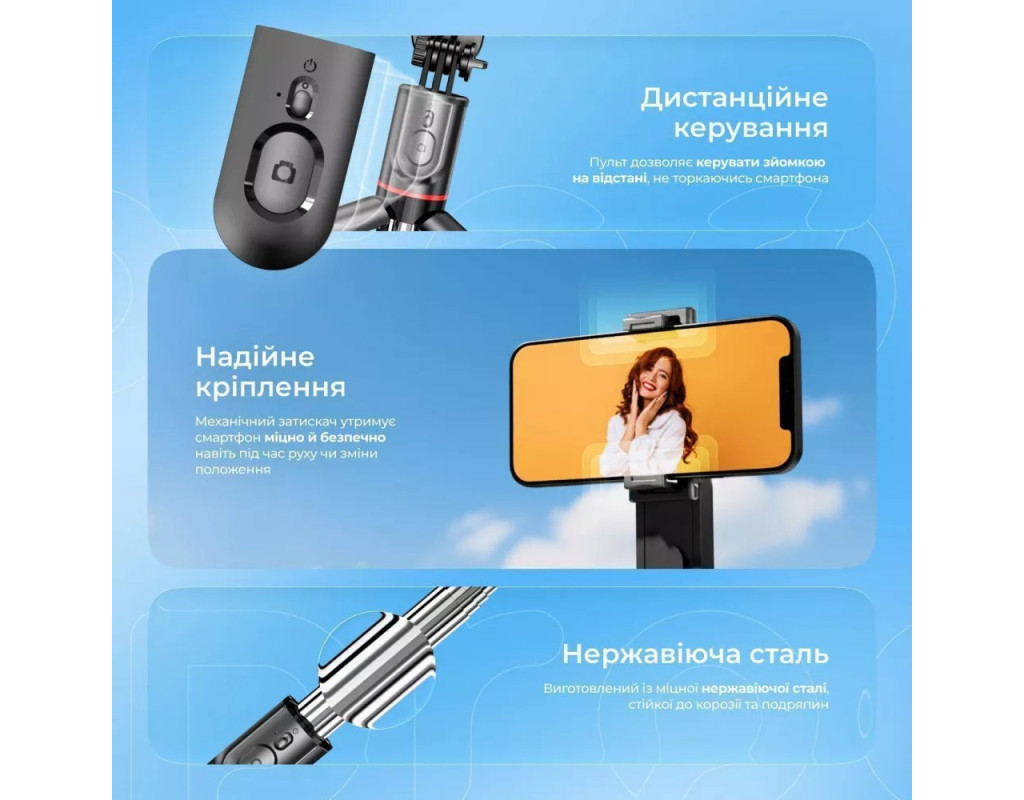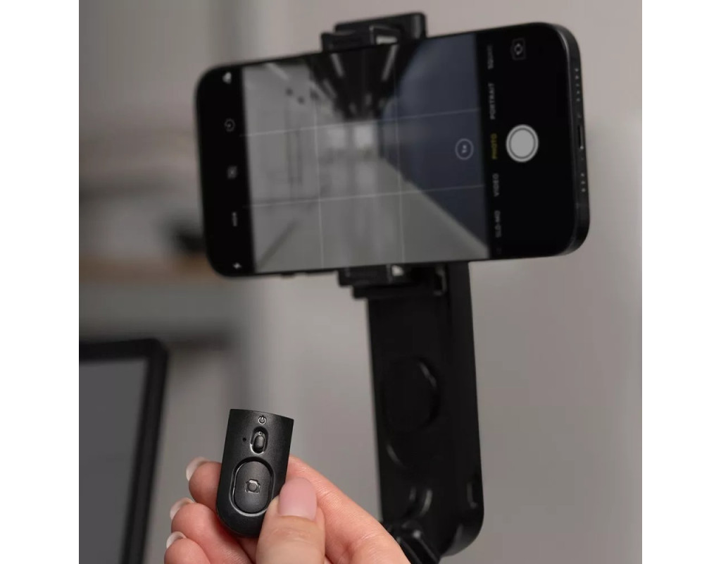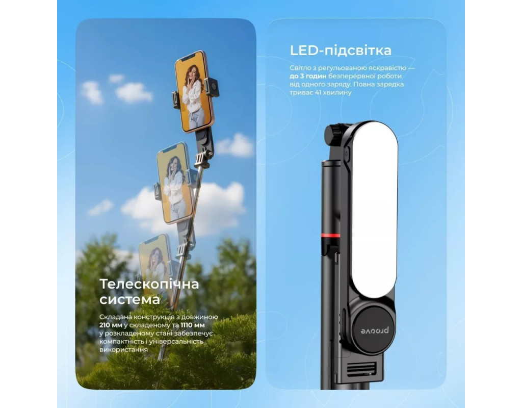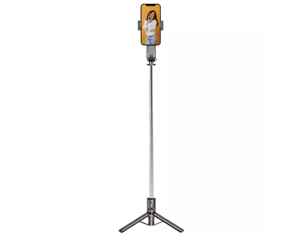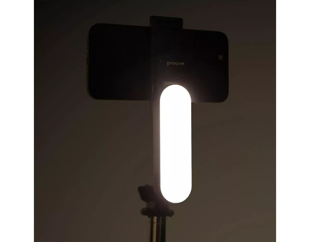 | Трипод оснащений вбудованою LED-підсвіткою, яка забезпечує необхідне освітлення. Телефон надійно фіксується у кріпленні та обертається на 360 градусів, щоб можна було легко змінити кадр, не виймаючи його з конструкції. За потреби можна витягнути бездротовий пульт дистанційного керування та користуватися ним на відстані.