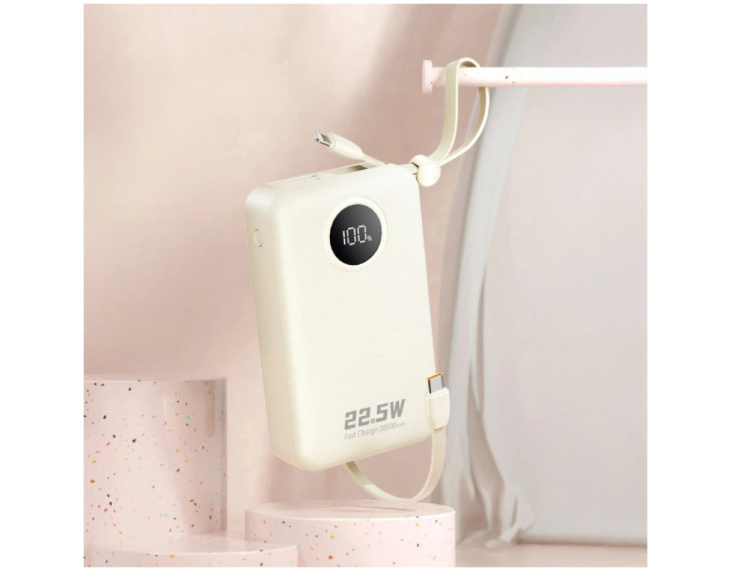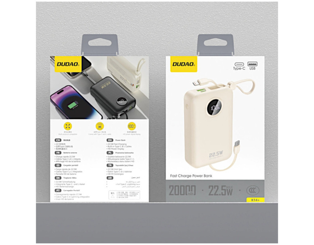 Батарея універсальна Dudao 20000mAh K14+ 22.5W, PD, QC, USB-A, USB-C(In/Out), with built-in USB-C/Lightning cables, White (6977196680023)