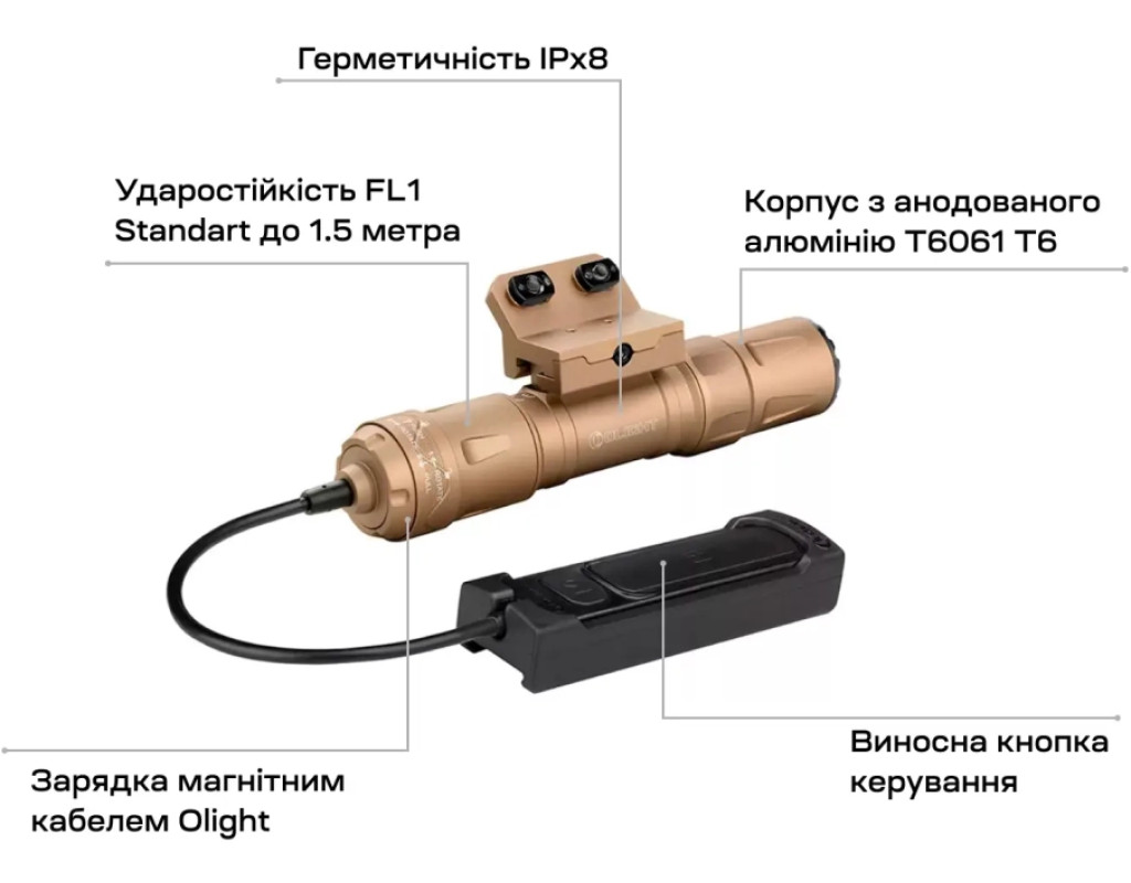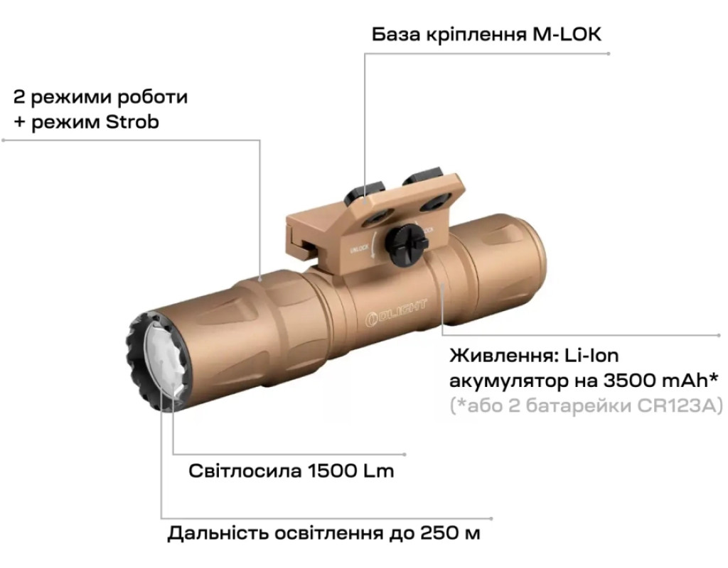 | Olight Odin S являє собою покращену версію підствольного ліхтаря Olight Odin. Odin S оснащений спеціальним швидкознімним кріпленням Picatinny або M-Lok, залежно від модифікації. Завдяки потужним світлодіодам High performance LED досягається світловий промінь до 1500 люмен на відстань до 250 метрів. Режим стробоскопа також допоможе захистити вас у надзвичайних ситуаціях, дозволяючи сигналізувати про ваше місцеперебування або використовувати для засліплення супротивника.Odin S працює від літій-іонного акумулятора 18650 ємністю 3500 мАг, що забезпечує надійну роботу в польових умовах. Завдяки акумулятору 18650 цей ліхтар має максимальний час роботи трохи понад 5 годин на найнижчому режимі, тому він може працювати протягом всієї місії. Швидко заряджайте ліхтар за допомогою магнітного зарядного пристрою Olight, що підтримує безпечну зарядку під час або перед завданням. Цей ліхтар також може працювати від батарейок CR123A, забезпечуючи подвійне живлення.Корпус ліхтаря виготовлений із анодованого алюмінію, має водонепроникність стандарту IPX-8 і витримує занурення у воду до 30 хвилин та на глибину до двох метрів. Поставляється з виносною кнопкою для керування.Режими роботи:З акумулятором 3500mAh 18650:- Високий: 1500 лм / 3,5 хвилини, потім 650 лм / 110 хвилин, потім 300 лм / 18 хвилин- Низький: 300 лм / 5 годин 10 хвилинЗ 2-ма батареями CR123A:- Високий: 1000 лм / 10 хв, majd 550 лм / 45 хв, majd 300 лм / 26 хв- Низький: 300 лм / 3 години- Режим Строб |