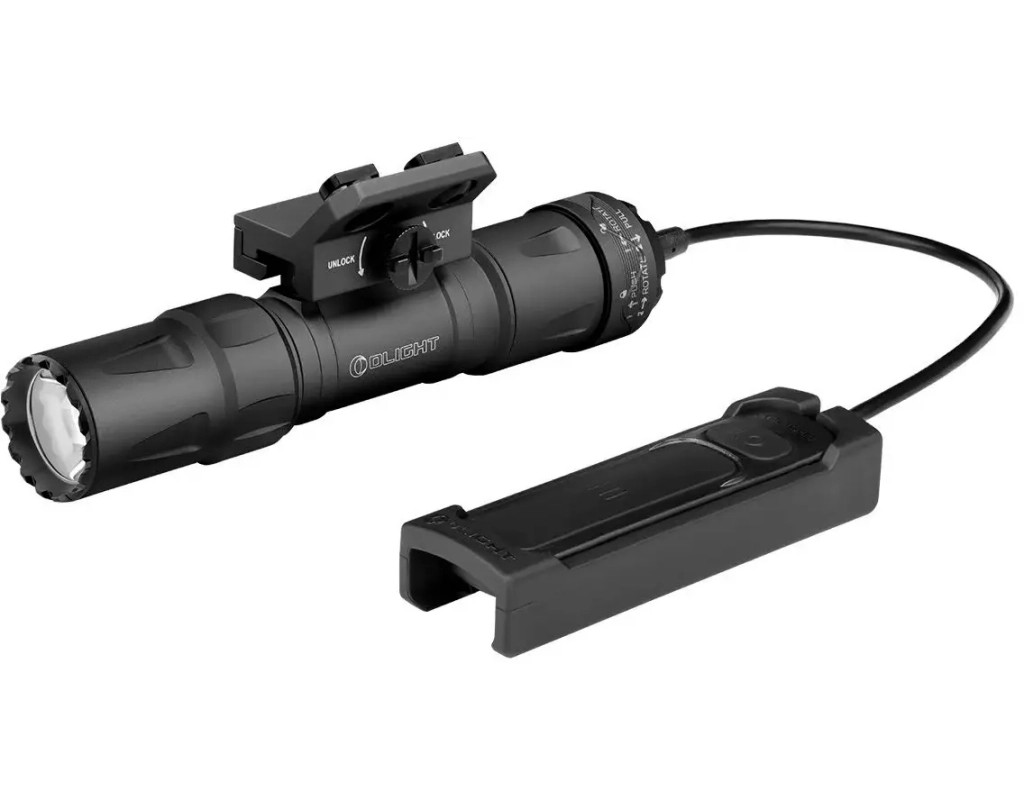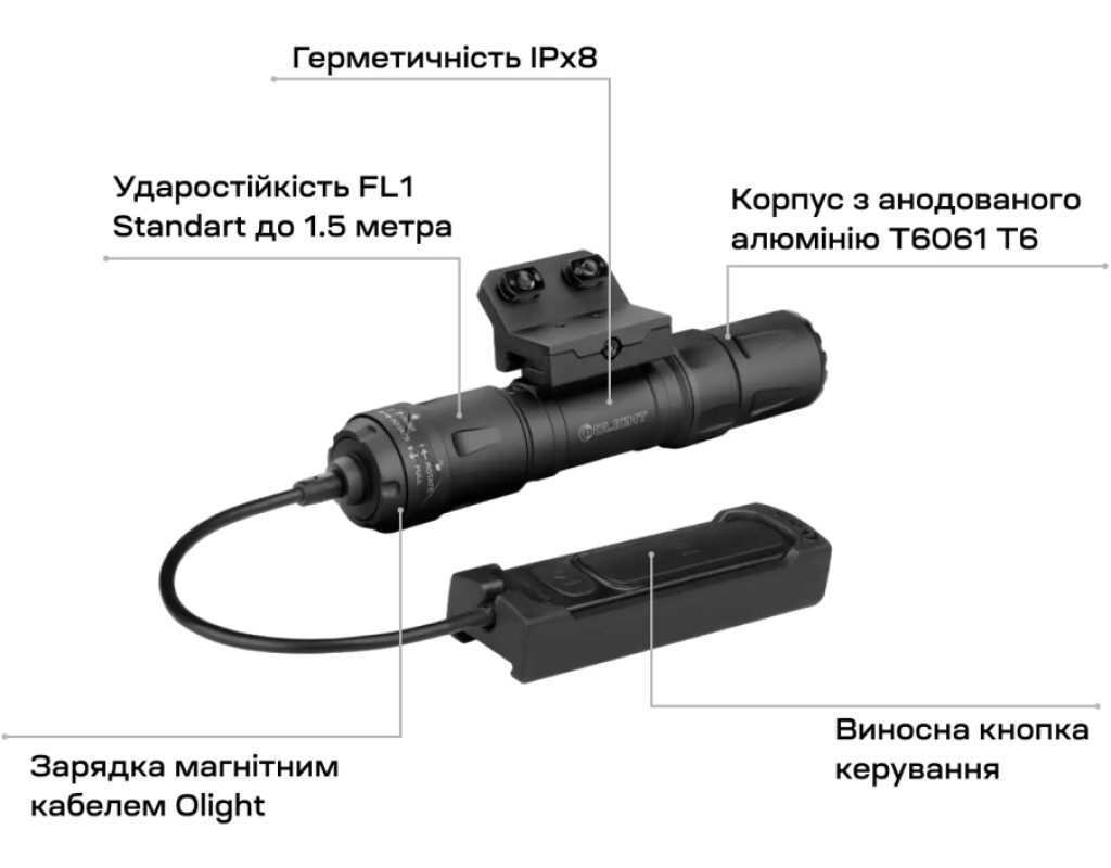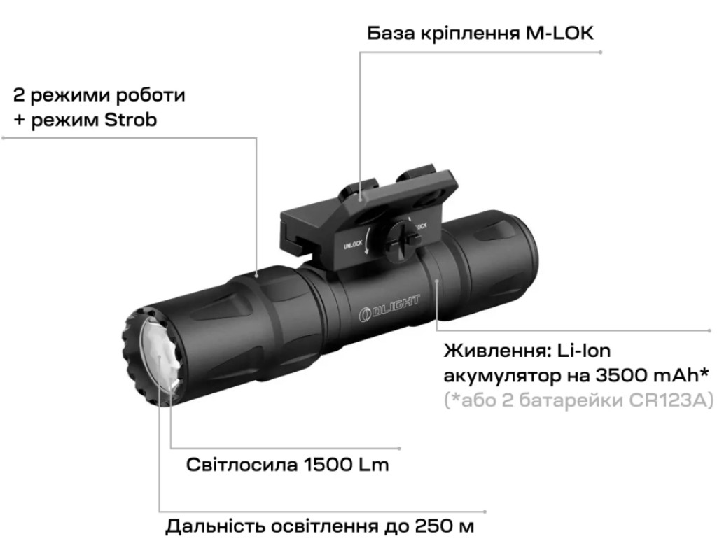 | Olight Odin S являє собою покращену версію підствольного ліхтаря Olight Odin. Odin S оснащений спеціальним швидкознімним кріпленням Picatinny або M-Lok, залежно від модифікації. Завдяки потужним світлодіодам High performance LED досягається світловий промінь до 1500 люмен на відстань до 250 метрів. Режим стробоскопа також допоможе захистити вас у надзвичайних ситуаціях, дозволяючи сигналізувати про ваше місцеперебування або використовувати для засліплення супротивника.Odin S працює від літій-іонного акумулятора 18650 ємністю 3500 мАг, що забезпечує надійну роботу в польових умовах. Завдяки акумулятору 18650 цей ліхтар має максимальний час роботи трохи понад 5 годин на найнижчому режимі, тому він може працювати протягом всієї місії. Швидко заряджайте ліхтар за допомогою магнітного зарядного пристрою Olight, що підтримує безпечну зарядку під час або перед завданням. Цей ліхтар також може працювати від батарейок CR123A, забезпечуючи подвійне живлення.Корпус ліхтаря виготовлений із анодованого алюмінію, має водонепроникність стандарту IPX-8 і витримує занурення у воду до 30 хвилин та на глибину до двох метрів. Поставляється з виносною кнопкою для керування.Режими роботи:З акумулятором 3500mAh 18650:- Високий: 1500 лм / 3,5 хвилини, потім 650 лм / 110 хвилин, потім 300 лм / 18 хвилин- Низький: 300 лм / 5 годин 10 хвилинЗ 2-ма батареями CR123A:- Високий: 1000 лм / 10 хв, majd 550 лм / 45 хв, majd 300 лм / 26 хв- Низький: 300 лм / 3 години- Режим Строб |
