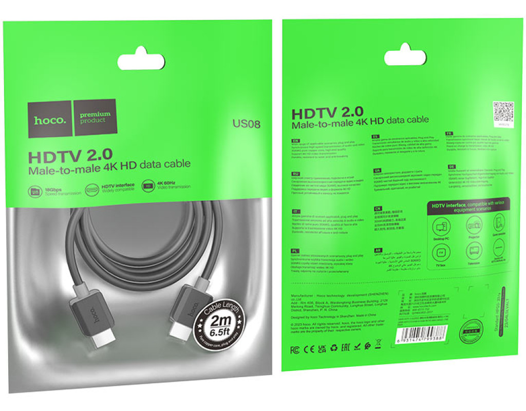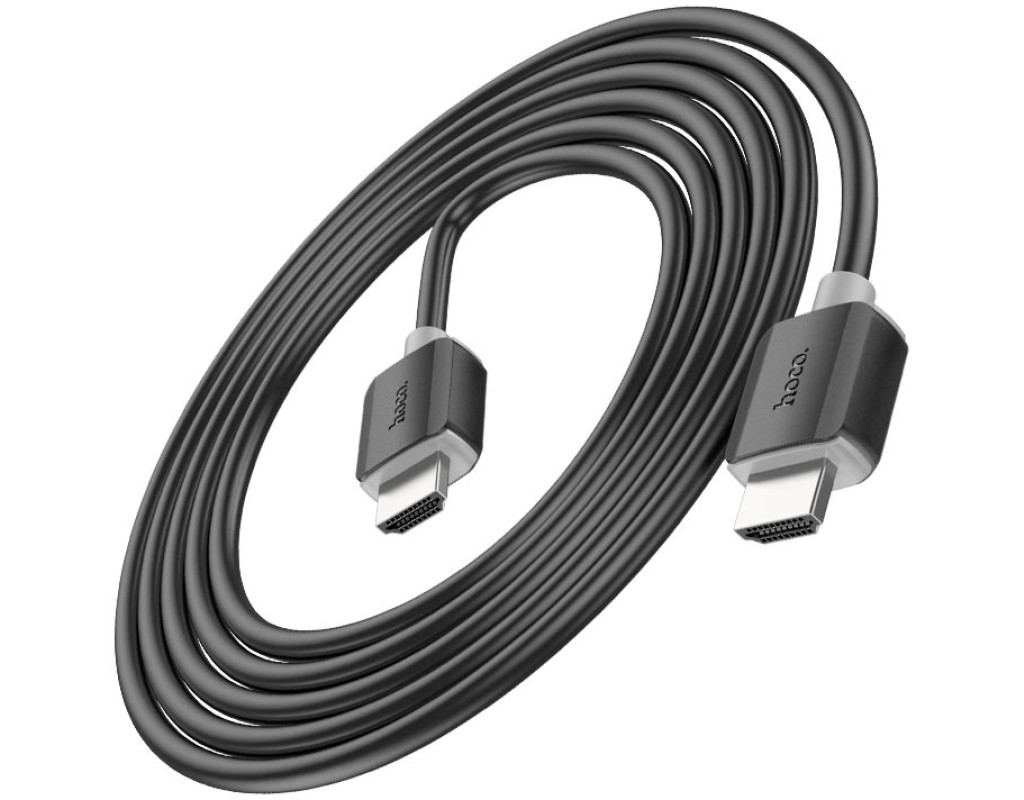 Кабель HOCO HDMI-HDMI 4Kx2K Ultra HD, 2m, v2,0, круглий Black, конектор Black, Blister