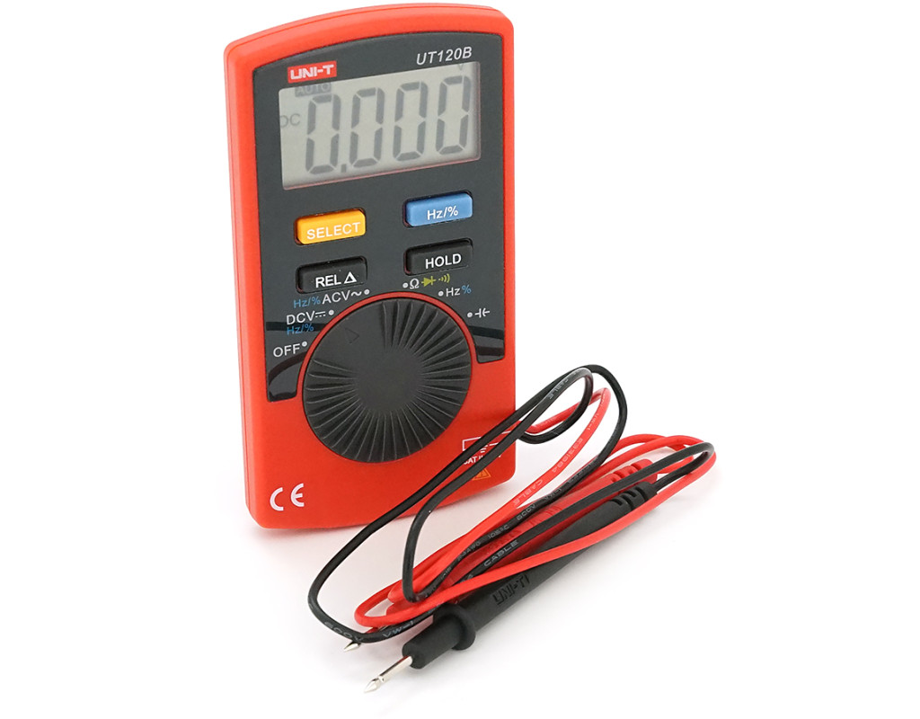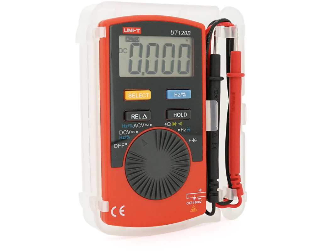 Мультиметр UNI-T UT120B: вимірювання V A Ω C Hz °C. Функції True RMS продзвінку тест діодів перевірка транзисторів. Габарити 110×58×11 мм
