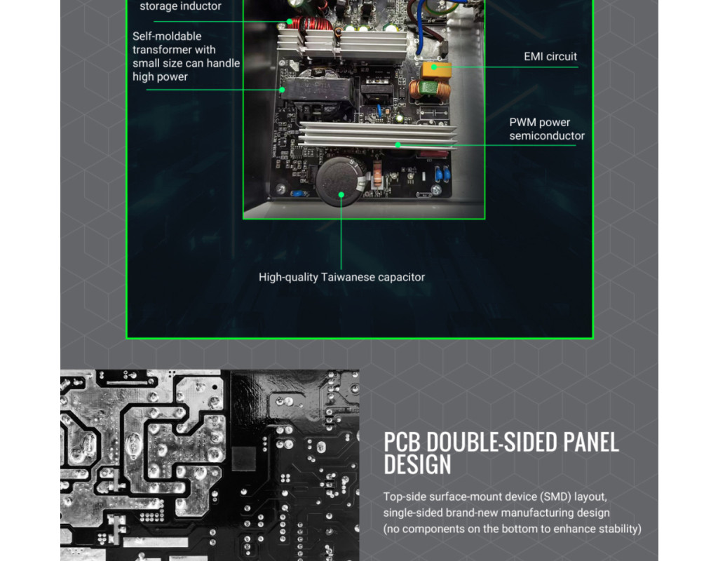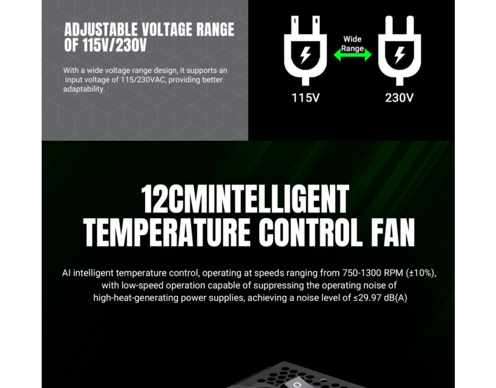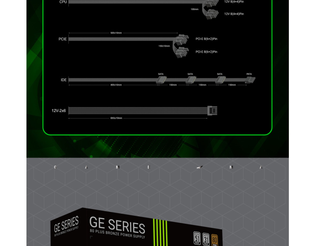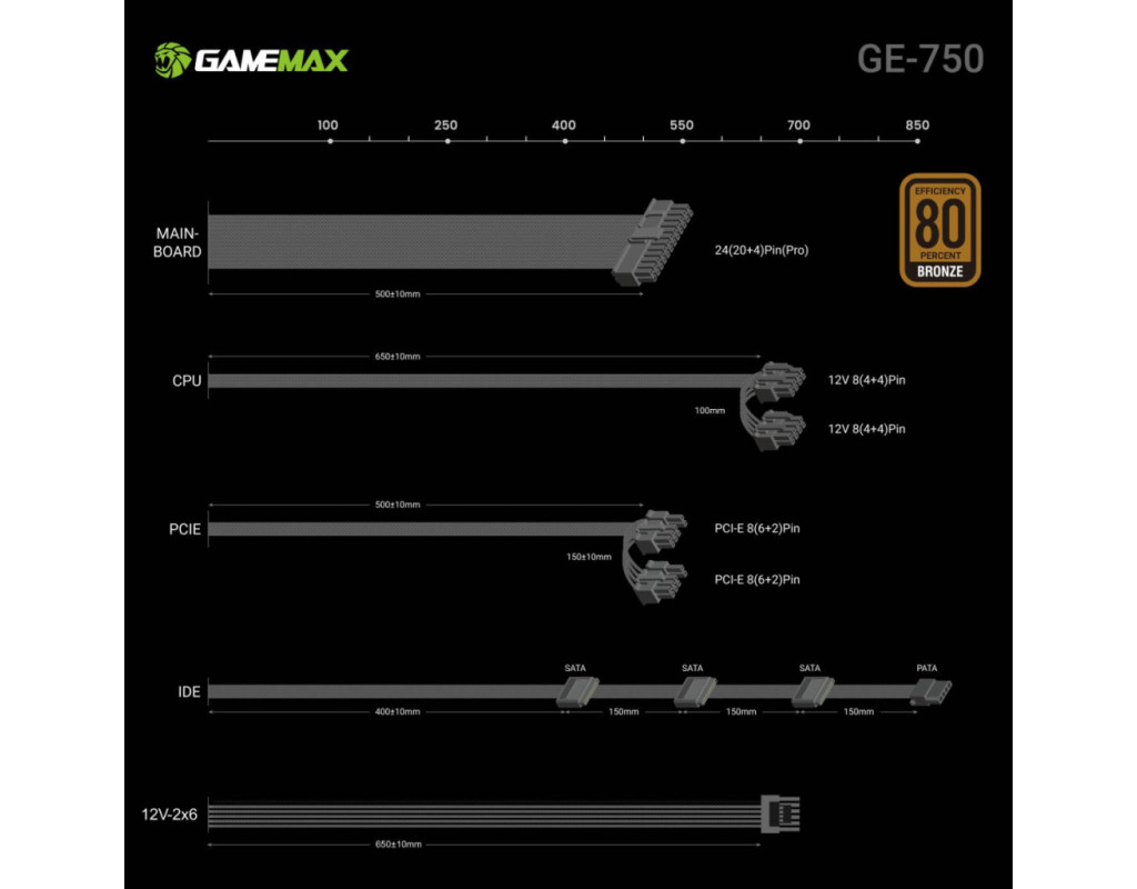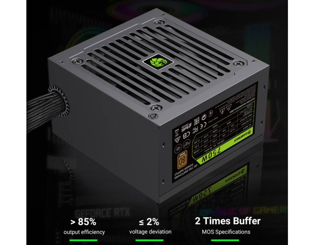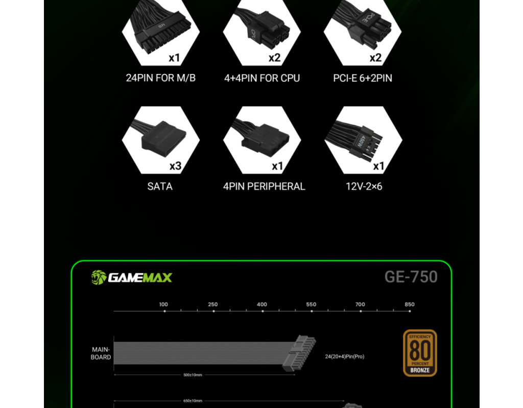 | GAMEMAX GE-750 — надійний блок живлення 750W з підтримкою ATX 3.1 і PCIe 5.1 GAMEMAX GE-750 — це сучасний блок живлення серії GE ECO, розроблений для продуктивних ігрових та робочих систем. Він поєднує високу ефективність, стабільну подачу живлення та підтримку новітніх стандартів ATX 3.1 і PCIe 5.1, що робить його чудовим вибором для конфігурацій із потужними процесорами та відеокартами нового покоління. Висока ефективність та економія енергії Блок живлення забезпечує до 85% ККД (рівень 80 PLUS Bronze) та оснащений технологією APFC, що оптимізує споживання електроенергії. Це дозволяє зменшити тепловиділення, підвищити стабільність роботи та скоротити витрати на електроенергію. Стабільна потужність для сучасних компонентів Потужна єдина лінія +12V гарантує надійне живлення високопродуктивних процесорів і відеокарт. GE-750 впевнено справляється з ігровими та професійними навантаженнями. Стабільна та чиста напруга DC-DC модуль забезпечує точну стабілізацію напруги та знижений рівень шумів, що позитивно впливає на довговічність компонентів і стабільність всієї системи. Підтримка новітніх відеокарт У комплекті передбачений 16-контактний роз’єм 12VHPWR (12V-2x6) з підтримкою PCIe 5.1 — готовність до роботи з найновішими GPU без використання перехідників. Тиха робота Інтелектуально керований вентилятор автоматично регулює швидкість обертання залежно від навантаження, забезпечуючи ефективне охолодження та низький рівень шуму. Повний комплекс захистів Вбудовані системи захисту OVP, UVP, OCP, SCP, OTP та OPP гарантують безпечну роботу та захищають комплектуючі від перенапруги, короткого замикання, перегріву й перевантаження. |