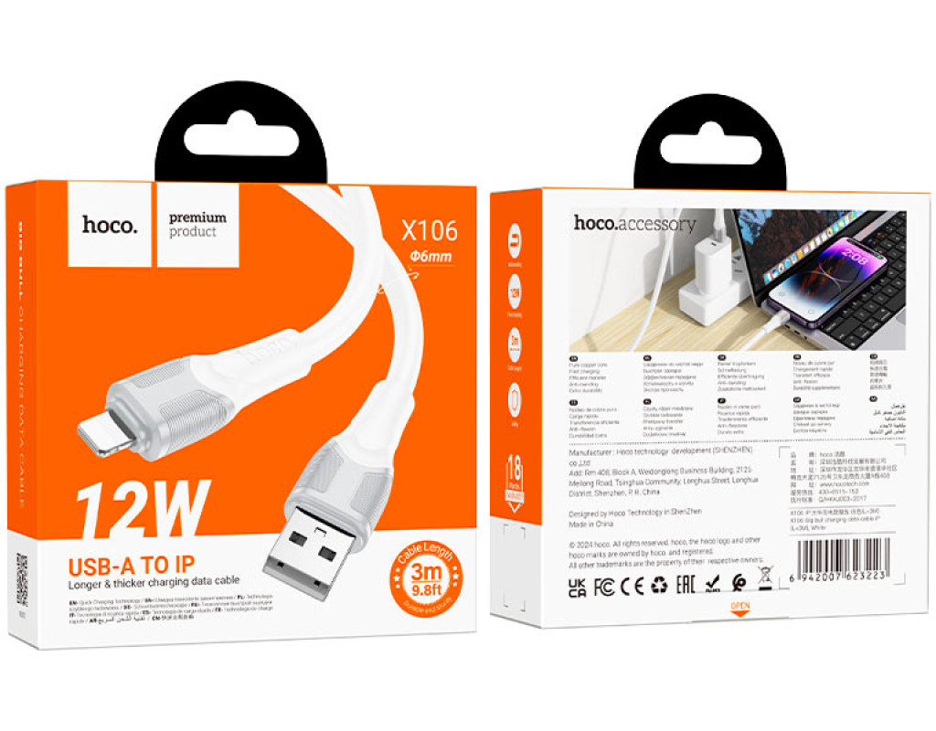 Кабель Hoco X106, Lightning-USB, 2,4A, довжина 3м, White, BOX