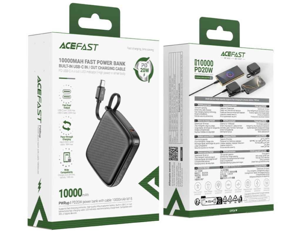 | УМБ Acefast 10000mAh 20W PD,QC3.0 USB-C In/Out with build Type-C cable, M15 Black |