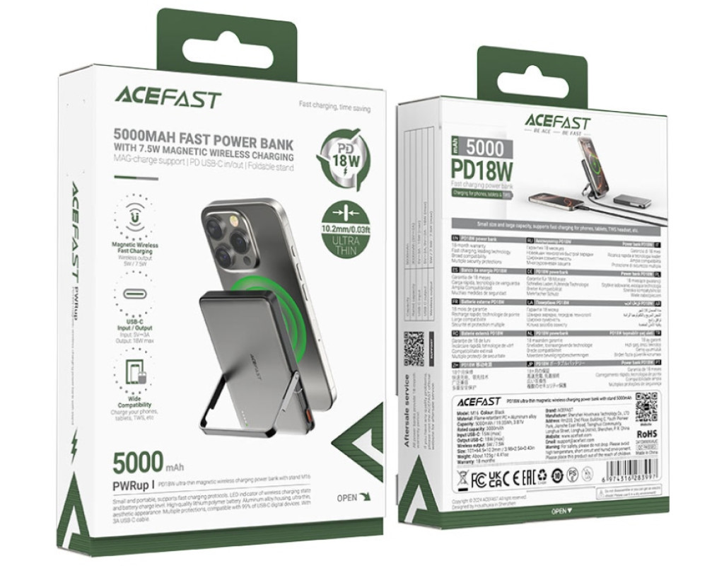 | УМБ Acefast Magnetic Wireless 5000mAh 18W PD,QC3.0 USB-C In/Out,with holder, ультра тонкий M16 Black |