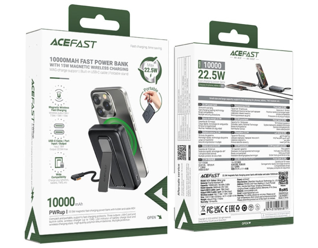 | УМБ Acefast Magnetic Wireless 10000mAh 22.5W PD,QC 3.0 USB-C In/Out, QI 15W M24 Metal Gray |