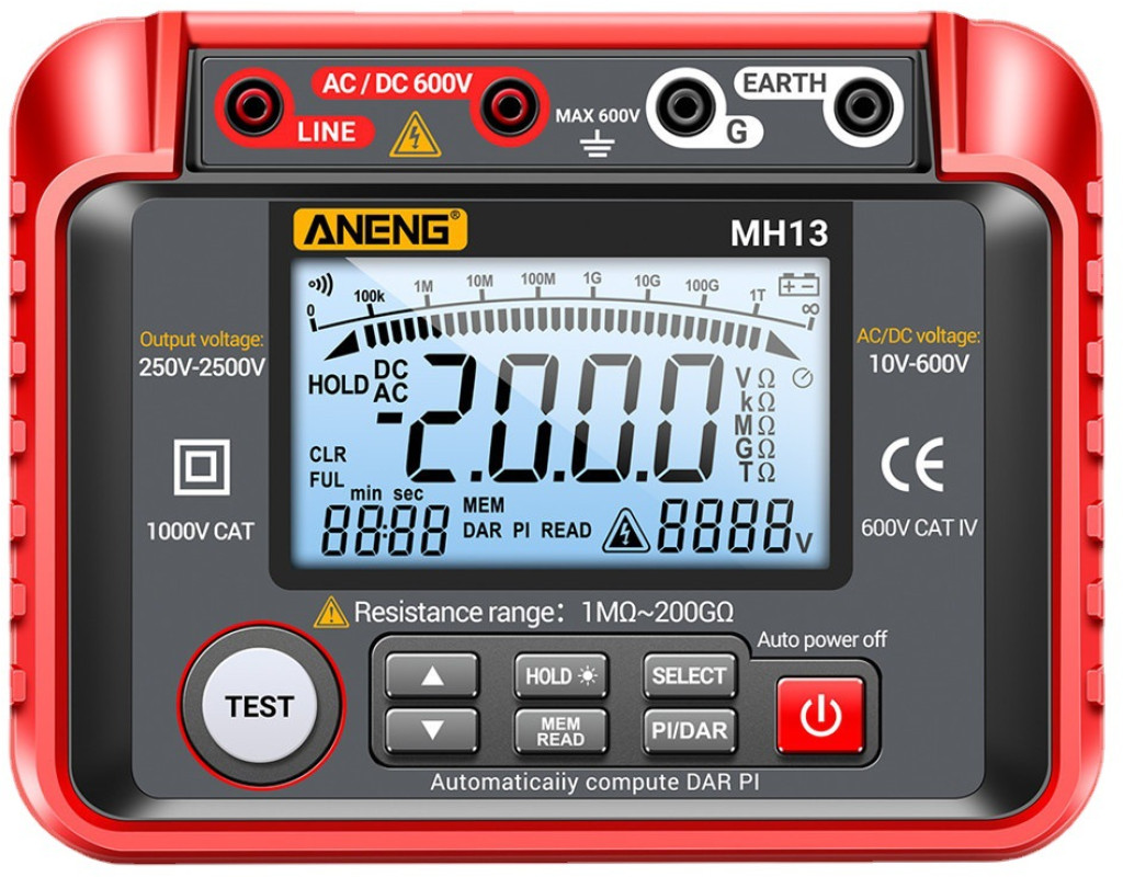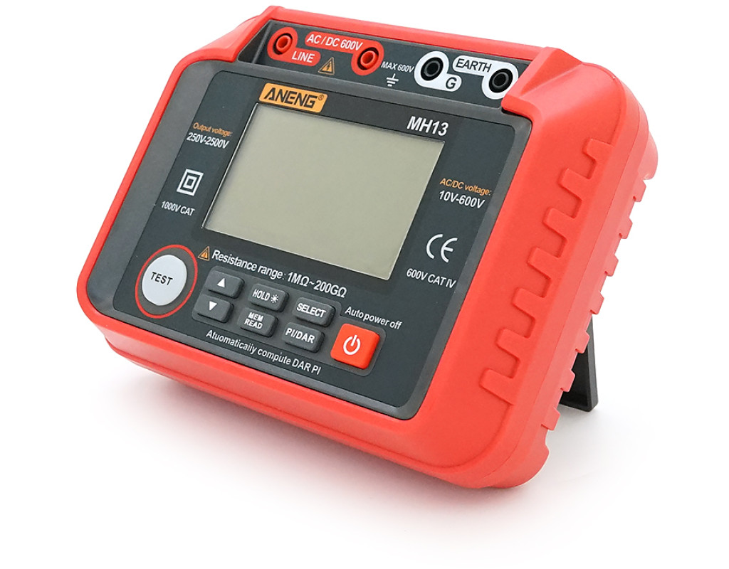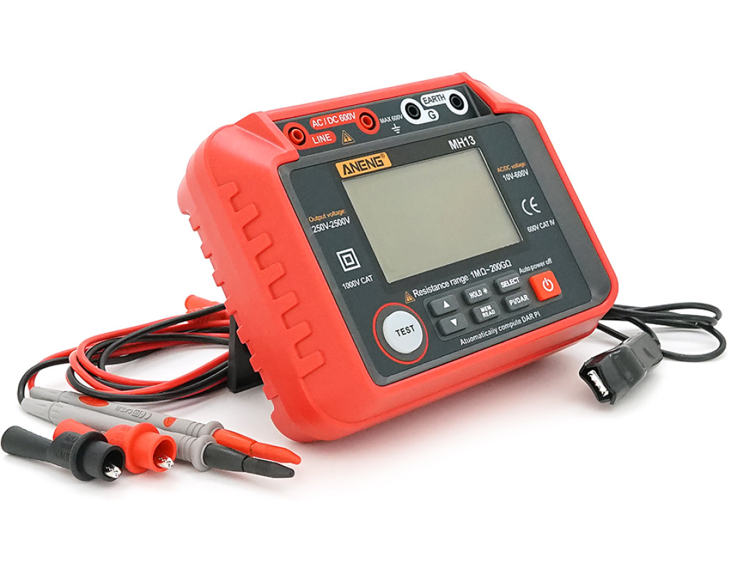 | Aneng MH13 - це багатофункціональний інструмент, який може вимірювати характеристики опору ізоляції, а також напругу змінного і постійного струму. Він точний та має стабільну продуктивність, використовується для вимірювання опору електричного обладнання, кабелю, електромеханічного обладнання, телекомунікаційного обладнання, електроенергетичних об`єктів та іншого опору ізоляції. Даний цифровий тестер має низьку втрату енергії під час перетворення напруги з 12 В на напругу 250 В / 500 В / 1000 В / 2000 В / 2500 В. Прилад використовує цифровий LCR міст для вимірювання опору та випробування ізоляції на опір. Інструмент застосовує функцію автоматичного скидання напруги з високою стабільністю та надійністю, що дозволяє вимірювати опір ізоляції від 1MΩ до 200GΩ. Підходить для вимірювання опору ізоляції різного електричного обладнання та ізоляційних матеріалів, таких як трансформатори, двигуни, кабелі, перемикачі, електричні прилади та ін. Підходить для технічного обслуговування, ремонту, тестування. Номінальна вихідна постійна напруга, яка легко перемикається між 250 В / 500 В / 1000 В / 2000 В / 2500 В завдяки відповідним клавішам. Прилад може також вимірювати напругу змінного та постійного струму в діапазоні 10-600 В. У пристрої реалізовано індикацію низького заряду батареї, щоб нагадати вам про заміну батарей вчасно. Інструмент має відмінний дизайн та стабільну продуктивність. Оснащений великим цифровим РК-дисплеєм з підсвічуванням, що легко читається, має ззаду складну підставку для установки приладу під кутом. Живлення проводиться від набору батарей із 8 штук. Має функцію автоматичного вимкнення для економії енергії. А міцний силіконовий захисний кожух добре захищає тестер від пошкоджень. Визначення коефіцієнта поглинання та індексу поляризації: - Коефіцієнт поглинання DAR: значення значення опору ізоляції протягом 1 хвилини до значення опору ізоляції протягом 15 секунд. - Індекс поляризації PI: відношення значення опору ізоляції протягом 10 хвилин до значення опору ізоляції протягом 1 хвилини, щоб визначити, чи вплинуло обладнання на опір ізоляції через вологу. особливості: - Вимірювання напруги змінного та постійного струму. - Вимір опору ізоляції. - 100 груп зберігання даних. - автоматичний розрахунок індексу поляризації, коефіцієнта поглинання. - Підсвічування екрану та функція утримання даних. Характеристики: - Колір червоний. - матеріал: АБС + силікон. - Екран: РК-екран з підсвічуванням. - Вихідна напруга: 250 В / 500 В / 1000 В / 2000 В / 2500 В. - Вимір опору ізоляції: 1MΩ-200GΩ. - Тестовий струм: 1 мА. - Струм короткого замикання: |