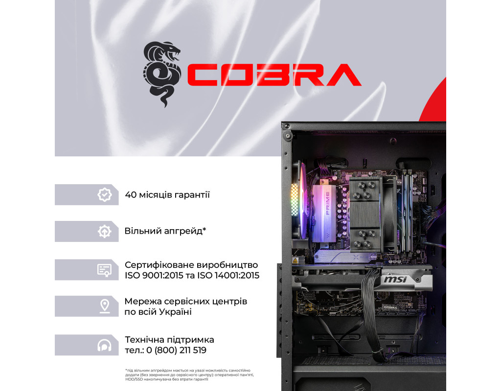 ПК COBRA збираються на базі комплектуючих визнаних світових лідерів, таких як Intel, AMD, MSI, ASUS, Zalman, ProLogix, Seagate, Toshiba, Hitachi, Transcend, Kingston і ін.