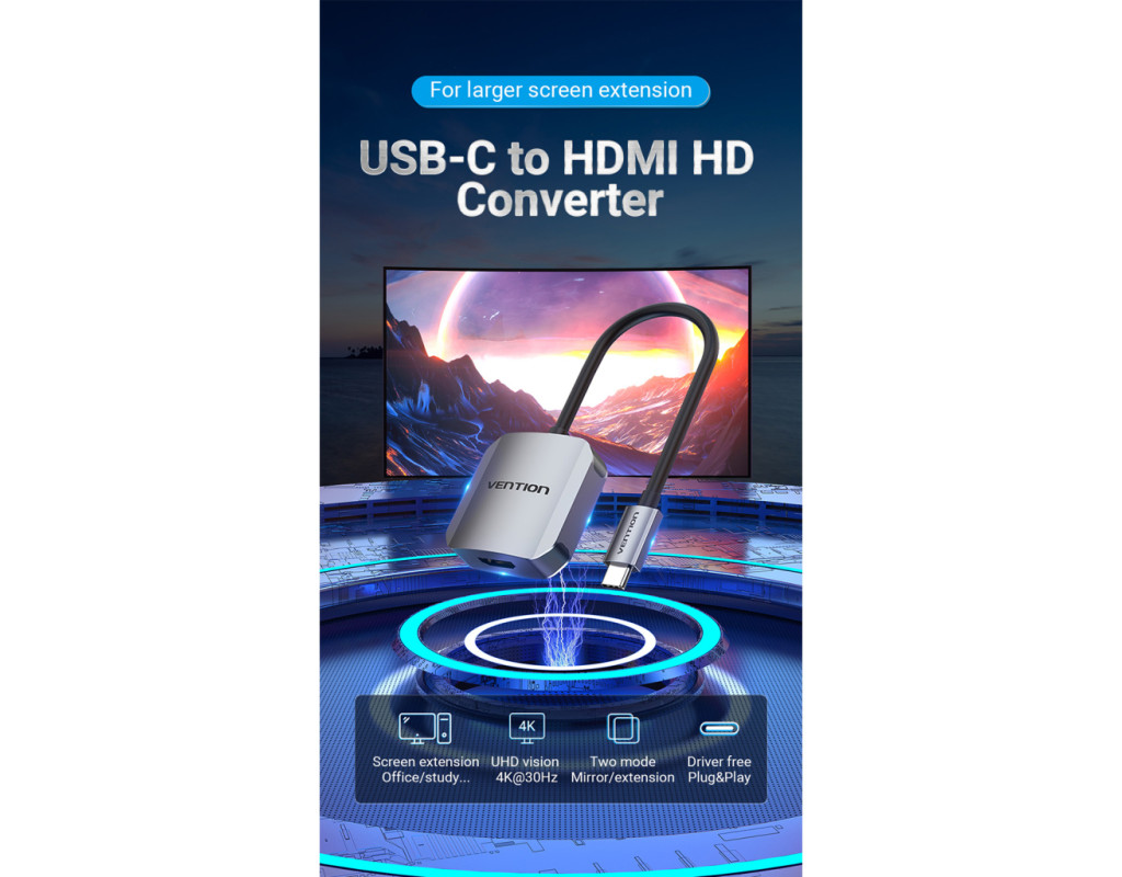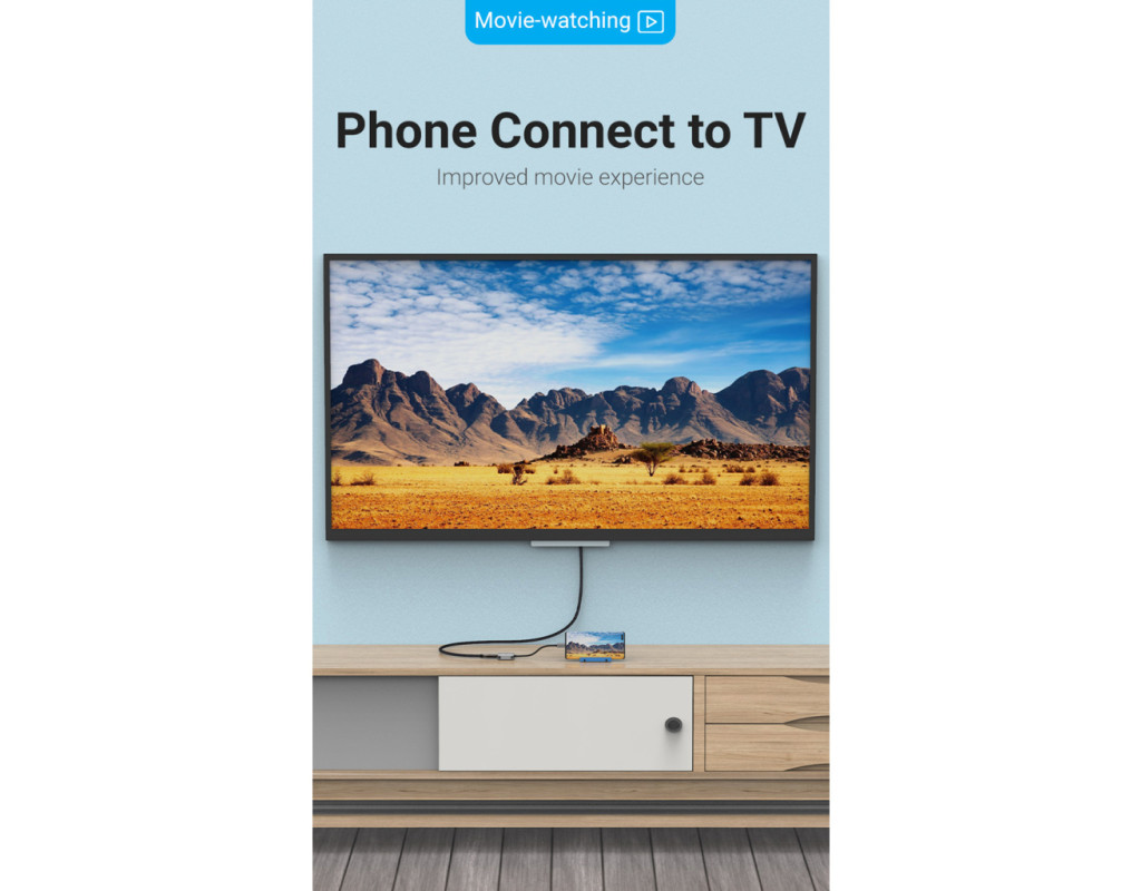 Під'єднуйте мобільний телефон до телевізора та дивіться фільми на великому екрані. З'єднайте ноутбук із проєктором та підвищуйте ефективність презентацій. Перехідник Vention підтримує роздільну здатність 4K та частоту оновлення 30 Гц. |