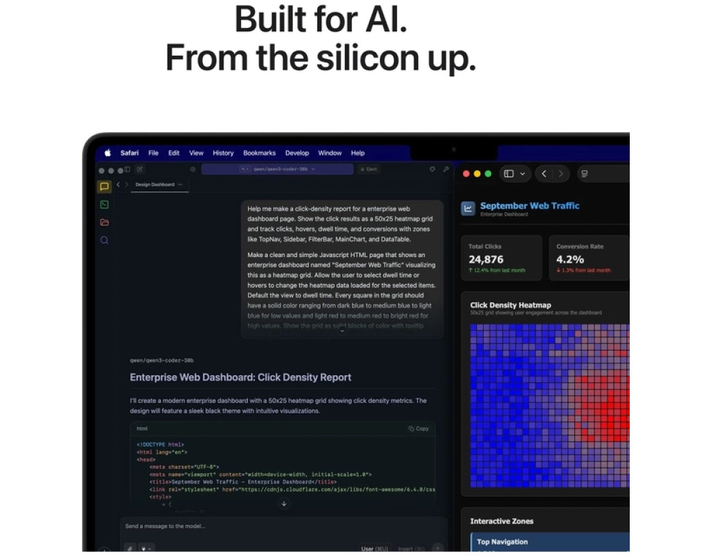 Створено для AI. Від самого кремнію. Apple silicon та кожна ключова підсистема, яка його забезпечує, розроблені з урахуванням AI — створюючи платформу, що повністю об’єднує апаратне забезпечення, програмне забезпечення та екосистему. Тому ви можете запускати складні AI-завдання безпосередньо на пристрої з неймовірною енергоефективністю. І, як завжди, безпека та конфіденційність закладені в основу, а не додані пізніше.
