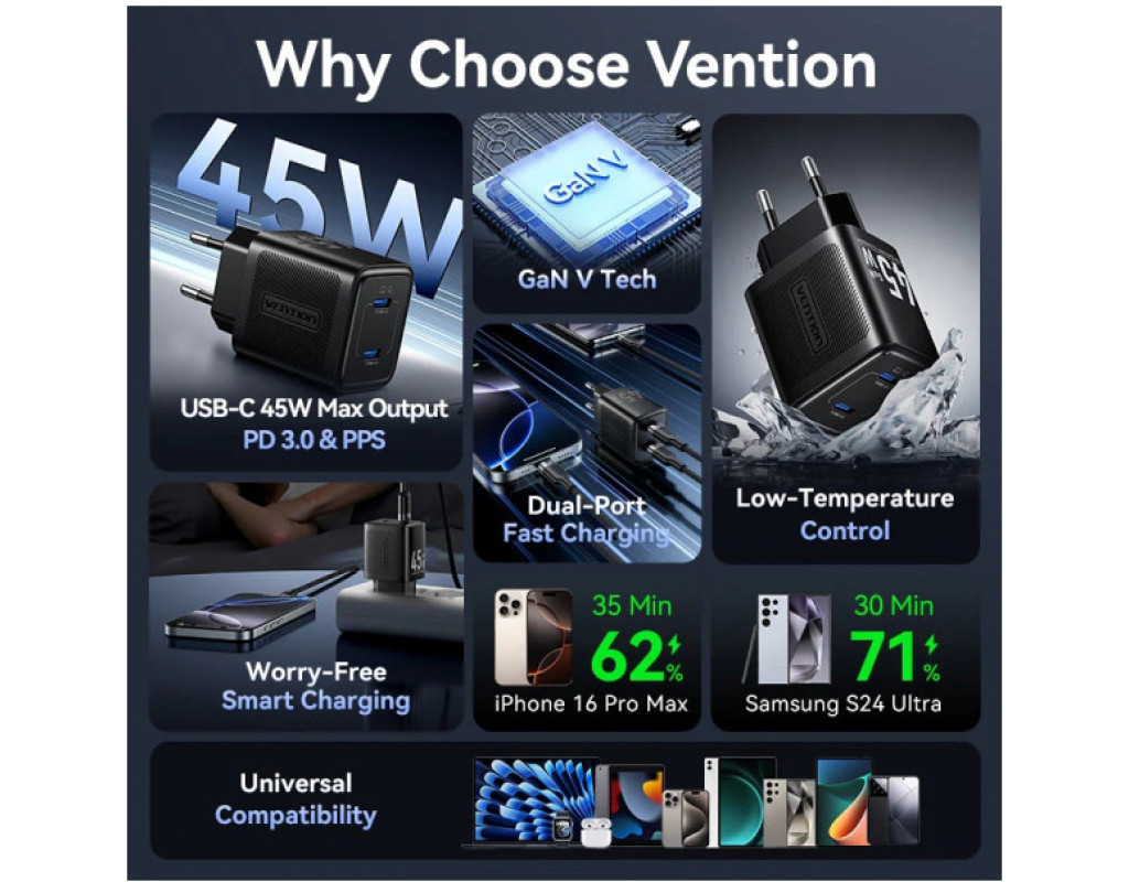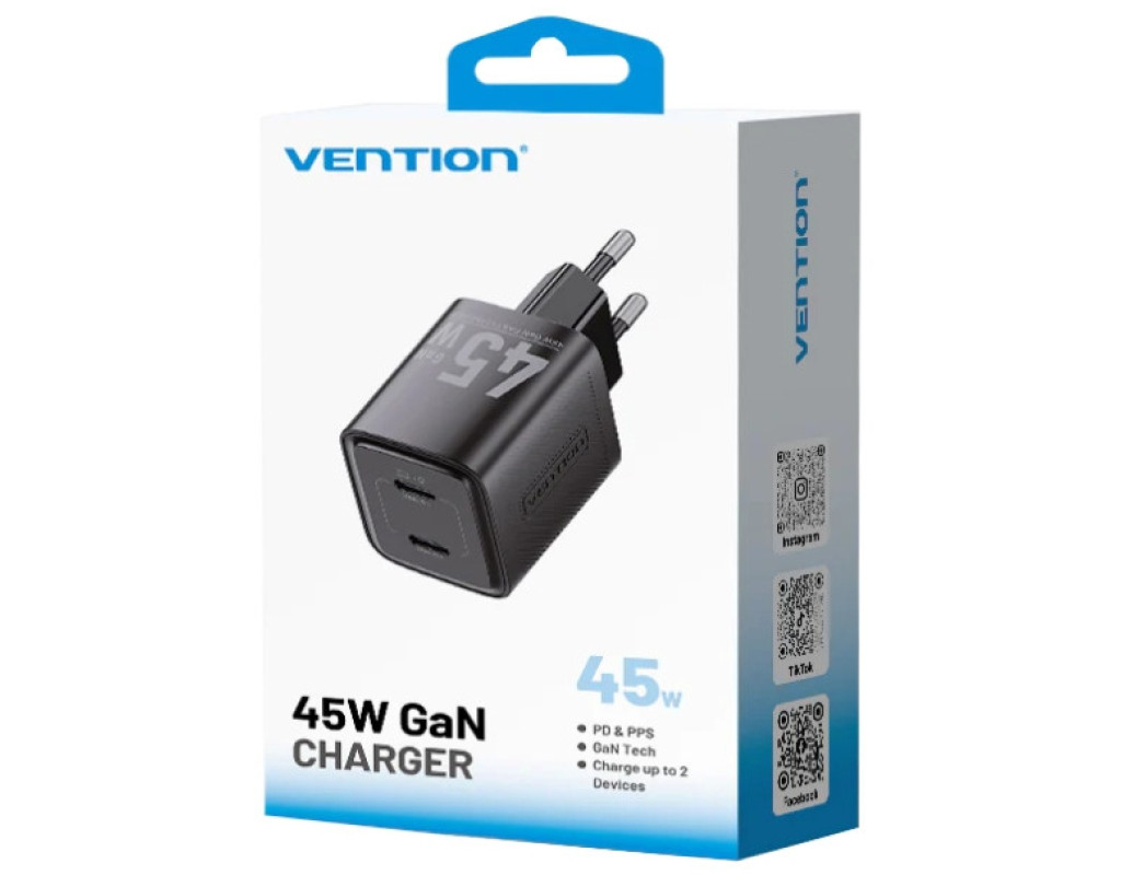 Зарядний пристрій Vention 2xUSB-C PD45W GaN black (FEFB0-EU)