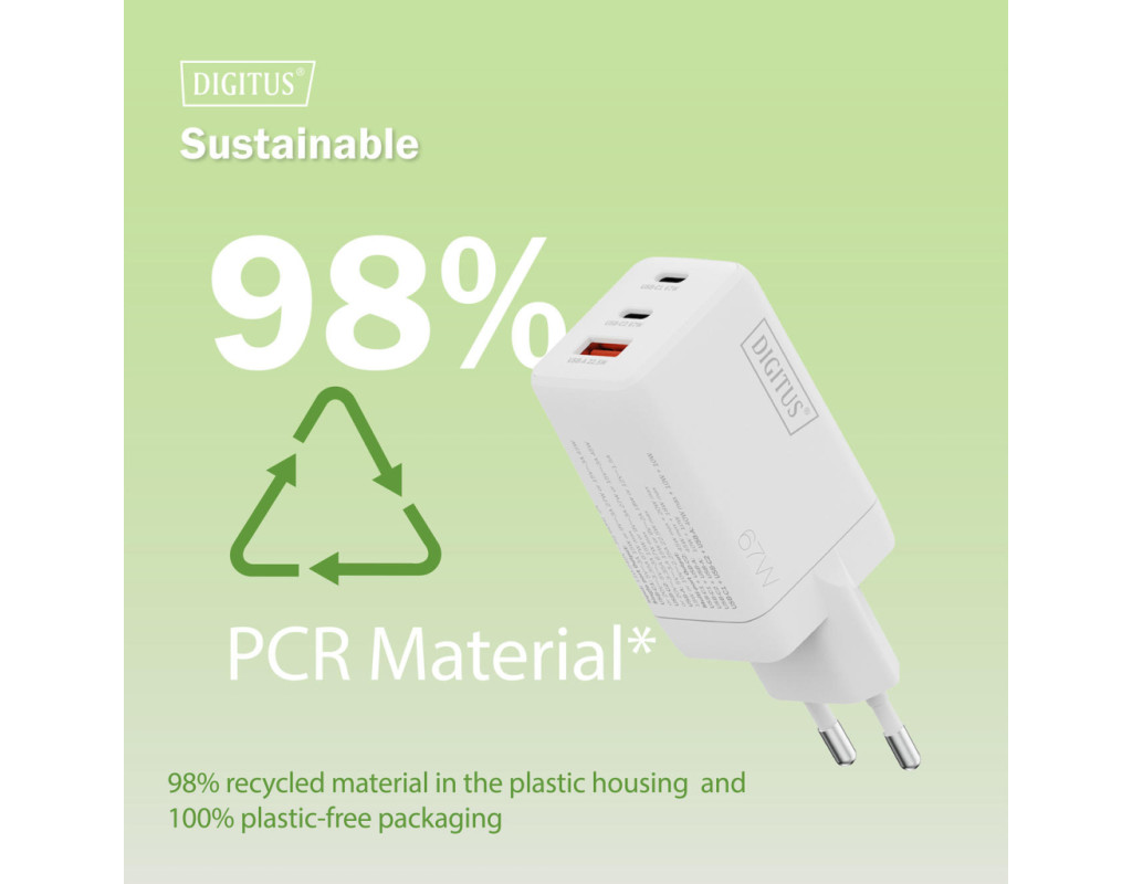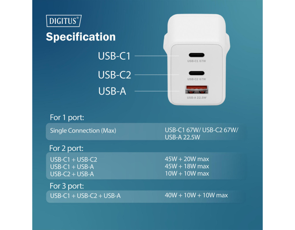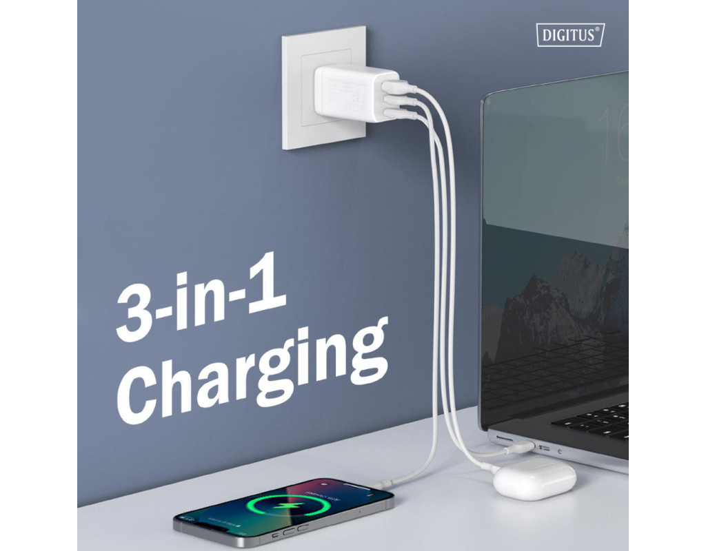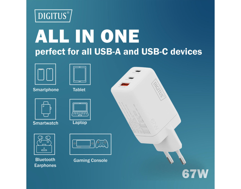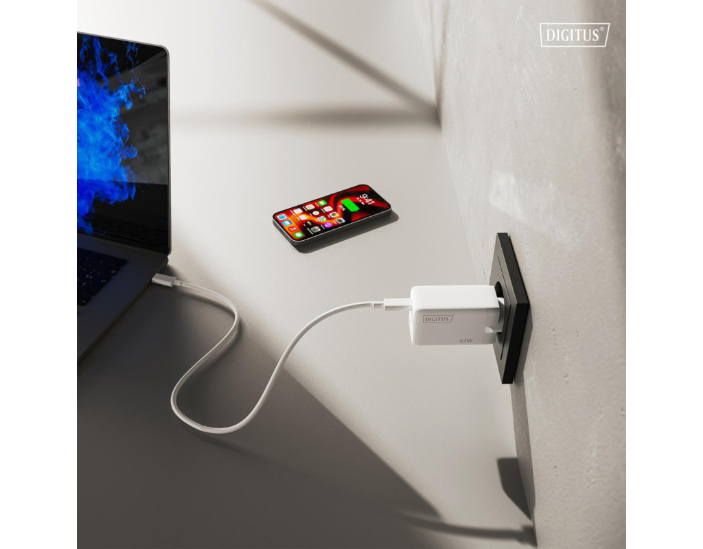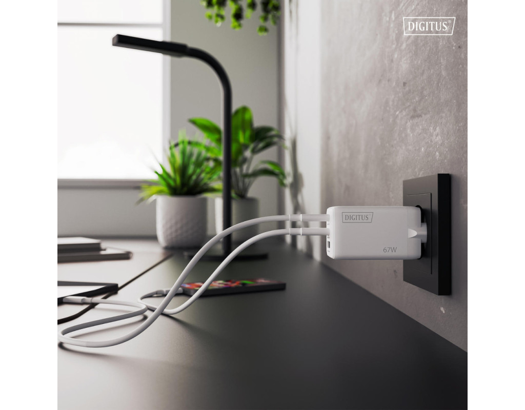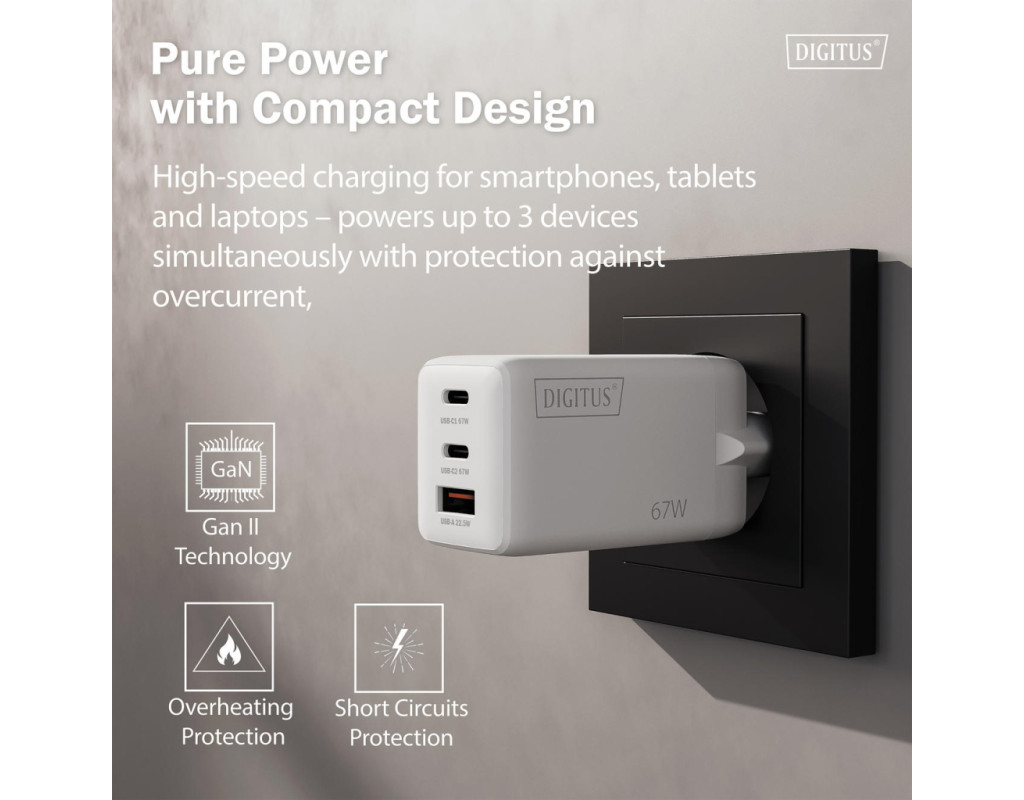 | Зарядний пристрій DIGITUS GaN 67W оснащений двома портами USB-C та одним USB-A для одночасного живлення кількох пристроїв. Технологія GaN II дозволяє поєднати високу потужність і компактний корпус. Пристрій підтримує інтелектуальний розподіл енергії залежно від підключення. Підходить для смартфонів, планшетів і ноутбуків. Орієнтований на щоденне використання вдома, в офісі або в дорозі. |