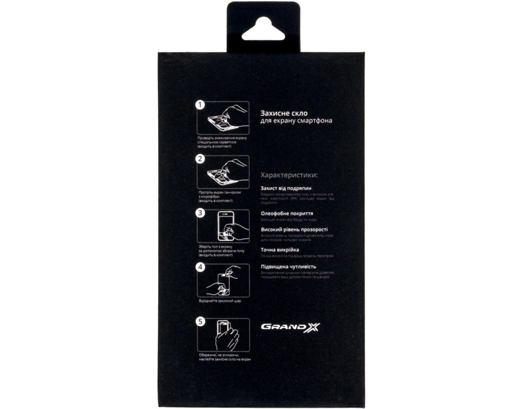 Скло Grand-X захистить від зовнішніх впливів, як-от подряпини, удари, жир та ін. У склі застосовуються прогресивні технології: олеофобне покриття, гартування скла, закруглені краї скла в горизонтальній площині. Олеофобне покриття мінімізує сліди від пальців. Встановлюється скло дуже просто, до комплекту входить усе потрібне (серветка для знежирення екрана, мікрофібра та спеціальний папір для зняття пилу). Після інсталяції скло надійно з'єднується з екраном пристрою й передає ваші торкання точно та швидко. Особливості: