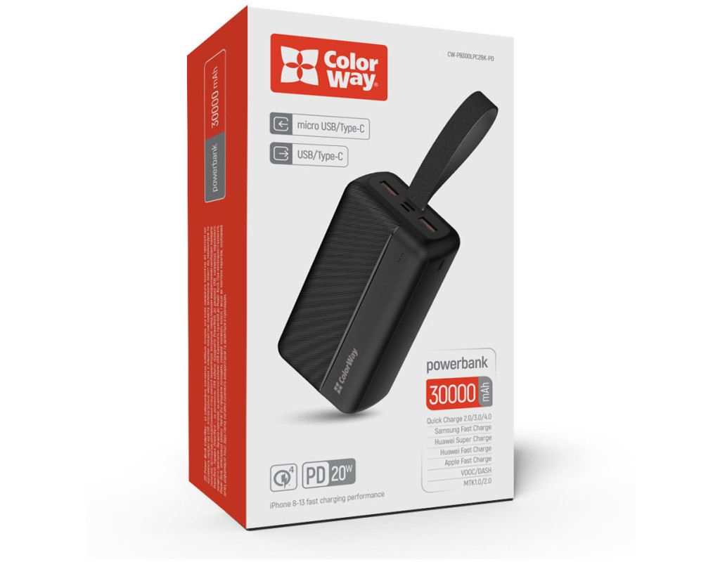 | Високоємний та функціональний УМБ ColorWay оснащений високоякісним літій-полімерним акумулятором 30000mAh, який має кілька рівнів захисту від короткого замикання та перепадів напруги, що гарантує безпеку та унеможливлює пошкодження мобільного пристрою. Підтримує практично всі сучасні протоколи швидкої зарядки такі як: (Power Delivery 3.0, Quick Charge 2.0&3.0&4.0, Huawei Fast Charge, Huawei Super Charge, Samsung Fast Charge, Apple Fast Charge, VOOC/DASH/WARP, MTK-PE+ 2.0), що дозволить із максимальною швидкістю заряджати Ваші пристрої. Можливість швидкої зарядки не тільки смартфона, а й самого Powerbank по Type-C - достатньо мати лише один кабель! Оснащений LED-індикатором, завдяки якому Ви зможете контролювати рівень заряду, а ємності в 30000 мА*год цілком вистачить для задоволення потреб у зарядці ваших гаджетів. |