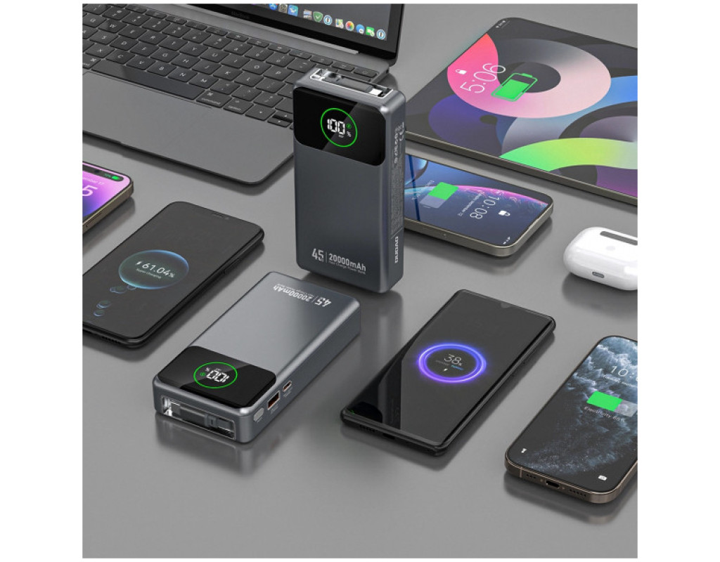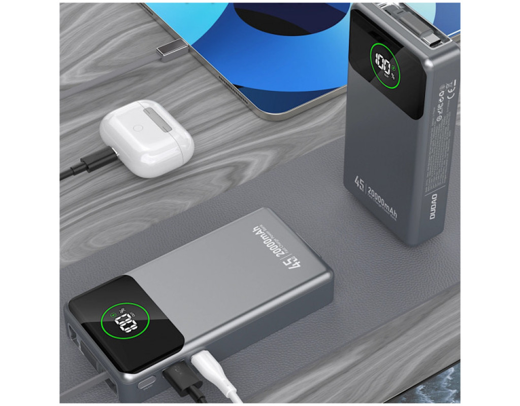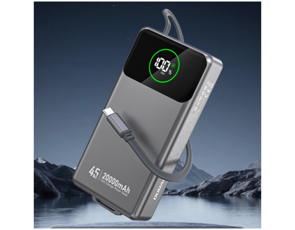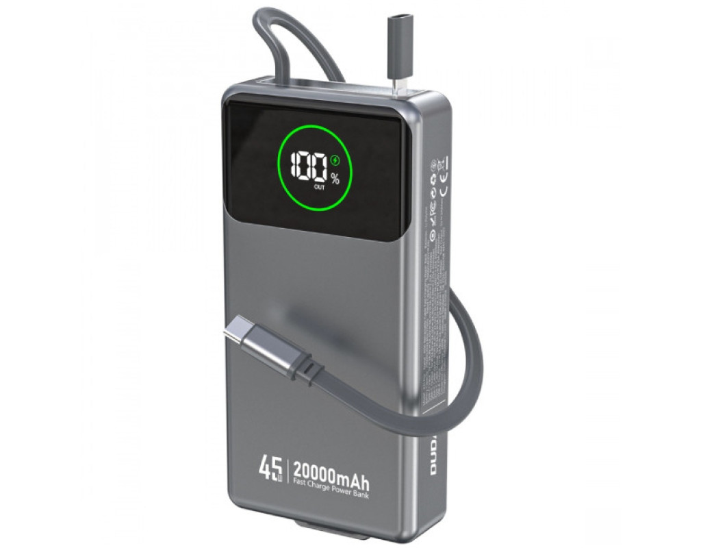 Dudao K31 Pro – це потужний портативний зарядний пристрій ємністю 20 000 мАг, розроблений для користувачів, яким потрібна висока потужність та повна мобільність. Він підтримує швидку зарядку до 45 Вт та стандарти PD, QC та VOOC, ефективно живлячи ноутбуки, планшети, смартфони та інші пристрої. Вбудований висувний кабель USB-C спрощує щоденне використання, а чіткий світлодіодний дисплей інформує про рівень заряду батареї. Міцний сірий корпус та практичний кабель роблять Dudao K31 Pro надійним джерелом живлення в будь-якій ситуації.
