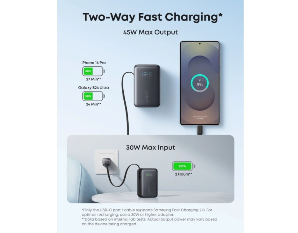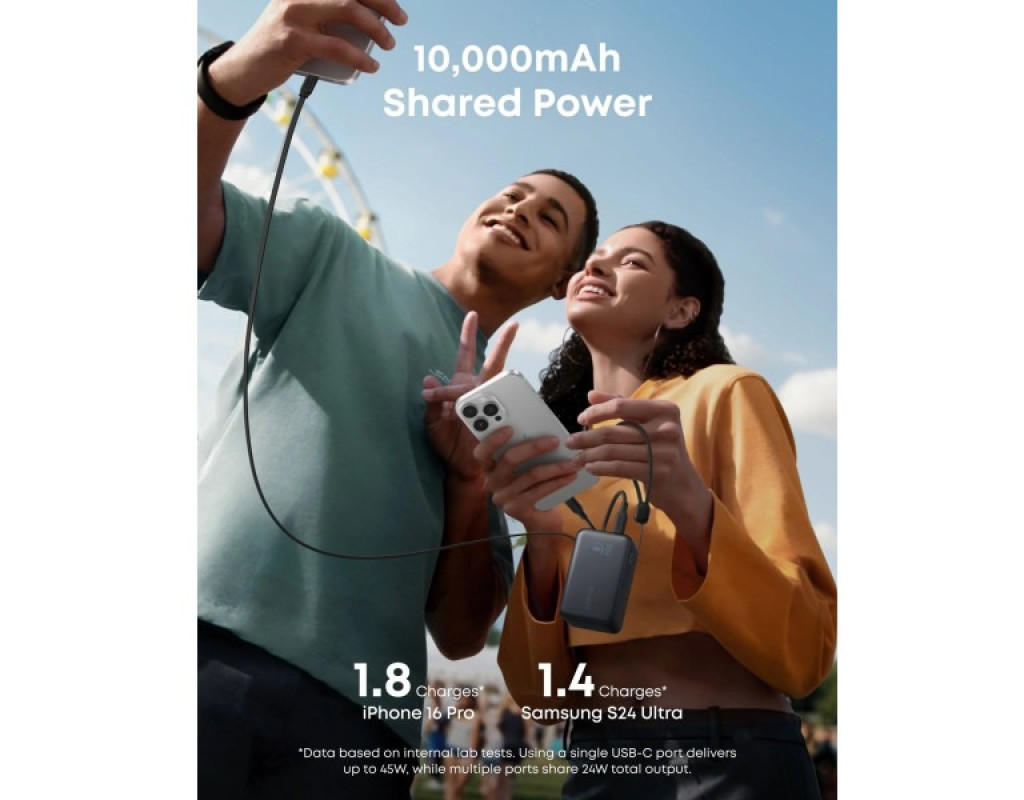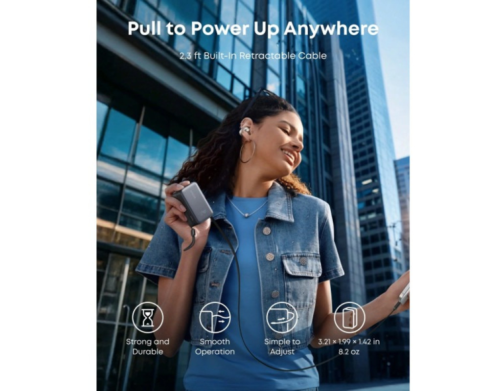 Отримай потужність, коли вона потрібна найбільше. Ємність 10000 мА/г, швидке заряджання до 45 Вт, підтримка технології наскрізного заряджання (Pass-Through), інтелектуальний дисплей і цілодобовий захист батареї гарантують безпечну та ефективну роботу. Порт USB-C сумісний із Samsung Fast Charging 2.0. Компактний і зручний у подорожах, на 16% менший за стандартні моделі, цей павербанк має вбудований висувний кабель, тому легко поміщається в кишеню чи сумку. Дозволений до перевезення в літаку. Двонаправлене швидке заряджання. Заряджай пристрої та сам павербанк одночасно. Потужність до 45 Вт через USB-C порт забезпечує надшвидке живлення гаджетів, а 30 Вт вхідна потужність дозволяє відновити заряд самого павербанка всього за 2 години. Наприклад, iPhone 16 Pro заряджається до 50% лише за 27 хвилин. Висувний кабель InstaCord. Насолоджуйся бездоганною зручністю: висувний кабель з фірмовою технологією Anker InstaCord витримує понад 20000 згинань і витягувань. Довжина кабелю 70 см регулюється під потреби, а система ролика працює плавно та без заплутування дротів. Інтелектуальний дисплей. Світлочутливий LCD-дисплей у режимі реального часу показує рівень заряду, статус заряджання та потужність кожного порту (USB-C / USB-A). Система ActiveShield виконує понад шість мільйонів температурних перевірок щодня, запобігаючи перегріванню та продовжуючи термін служби батареї. |