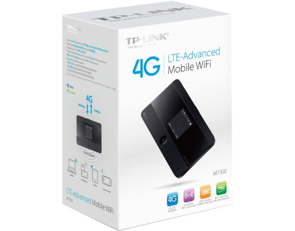 Мобільний Wi-Fi роутер TP-Link M7350 Мобільний маршрутизатор M7350 від компанії TP-LINK є передовим пристроєм для спільного підключення до мережі 4G. Щоб створити мобільну дводіапазонну точку доступу Wi-Fi вам потрібно тільки вставити в пристрій SIM-карту 4G. Завдяки швидкості вхідного трафіку до 150 Мбіт / с і швидкості вихідного трафіку до 50 Мбіт / с маршрутизатор M7350 здатний надати бездротове підключення до мережі 4G одночасно 15 користувачам. Компактний розмір і акумулятор на 2000 мА * г роблять пристрій ідеальним супутником для подорожей, забезпечуючи час роботи до 10 годин. Завдяки інформативному TFT-дисплею користувачам буде набагато зручніше відстежувати робочі показники пристрою, а саме: потужність сигналу, тип мережі (4G / 3G / 2G), стан Wi-Fi, повідомлення, стан підключення до Інтернет, статистику трафіку і режим підключення. 4G LTE: швидше з'єднання - більше можливостей. Завдяки підтримці останнього покоління зв'язку 4G LTE мобільний маршрутизатор M7350 може досягати швидкості завантаження до 150 Мбіт / с, дозволяючи без затримок переглядати HD-відео, завантажувати файли в лічені секунди і вести відео-чат без обривів з'єднання. Wi-Fi підключення до 15 пристроїв. Додаткова настройка не потрібно: просто вставте 4G SIM-карту, щоб створити надійний мобільний дводіапазонну точку доступу Wi-Fi. Створюйте надійне спільне 3G / 4G-підключення для 15 пристроїв: планшетів, мобільних телефонів, ноутбуків, ігрових приставок і т.д. Компактний гаджет для життя в русі. Мобільний маршрутизатор M7350 володіє компактним сучасним дизайном, завдяки якому пристрій ідеально підійде для подорожей, бізнес-поїздок і активного відпочинку - куди б ви не поїхали. 10 годин спільного доступу до мережі 4G - створений для подорожей. Завдяки потужному акумулятору на 2000 мА * ч маршрутизатор може працювати до 10 годин при повній потужності і до 600 годин в режимі очікування. Зарядка проводиться при підключенні пристрою по кабелю micro USB до ноутбука, портативного зарядного пристрою - це здатне забезпечити тривалий спільний доступ до мережі 4G. |