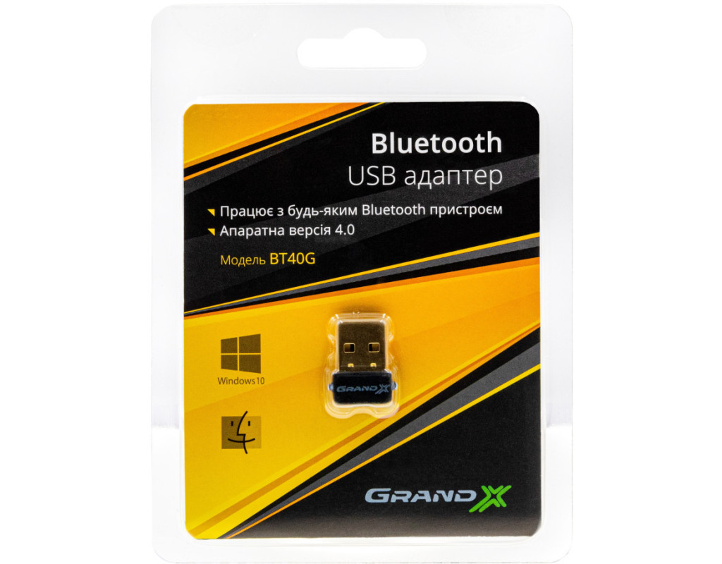 | Grand-X BT40G - це мініатюрний Bluetooth адаптер, який призначений для швидкісного бездротового обміну даними між ПК або ноутбуком та іншими мобільними пристроями Bluetooth (наприклад, смартфон, планшет, стерео-гарнітура тощо). Використання двох адаптерів робить можливим прямий обмін даними між двома комп'ютерами. Версія Bluetooth 4.0, забезпечує більш високу швидкість передачі даних і прискорене підключення до пристроїв. Компактні розміри адаптера дозволяють йому легко інтегруватися в корпус будь-якого ноутбука або стаціонарного ПК. Створює бездротове з'єднання в радіусі до 10 метрів між ноутбуком/ПК та пристроями Bluetooth. Також працює з попередніми версіями Bluetooth. |