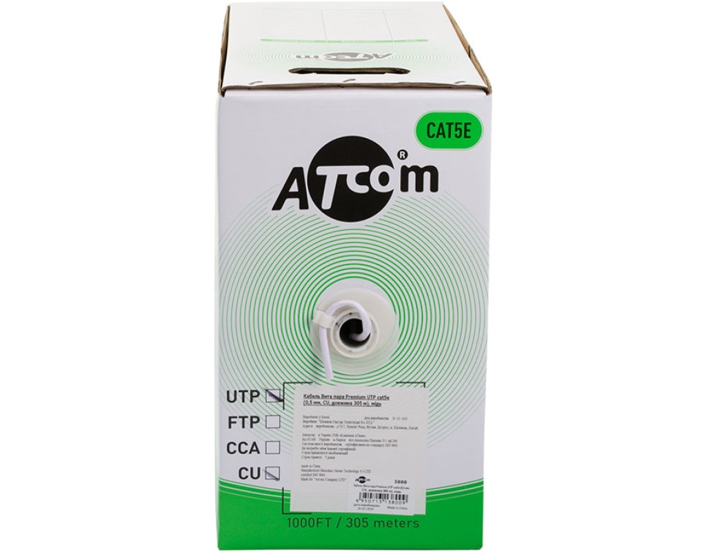 | Кабель UTP 305м cat.5e Premium Atcom (3800)-вита пара Atcom Premium UTP Lan cable CAT5E (UTP 0,5mm CU за бухту 305 м). Це кабель, смуга частот 125 МГц , 4-парний кабель, вдосконалена категорія 5. Швидкість передачі даних до 100 Мбіт/з при використанні 2 пар і до 1000 Мбіт/з при використанні 4 пар. Кабель категорії 5e є найпоширенішим і використовується для побудови комп'ютерних мереж. Кабель забезпечує швидкість передачі даних до 100 Мбіт/с. Переваги даного кабелю в більш низької собівартості і меншій товщині. Товщина ізоляції провідника кабеля UTP 305м cat.5e Premium Atcom (3800) - близько 0,2 мм, матеріал зазвичай полівінілхлорид (англійське скорочення PVC), для більш якісних зразків 5 категорії - поліпропілен (PP), поліетилен (PE). Вита пара - це сучасний компонент кабельних систем. Застосовується в телекомунікаціях і в комп'ютерних мережах в якості мережевого носій в багатьох технологіях, таких як Ethernet, ARCNet і Token ring. Сьогодні, завдяки своїй доступній ціні і простоті установки, є найбільш популярним рішенням для побудови локальних мереж. |