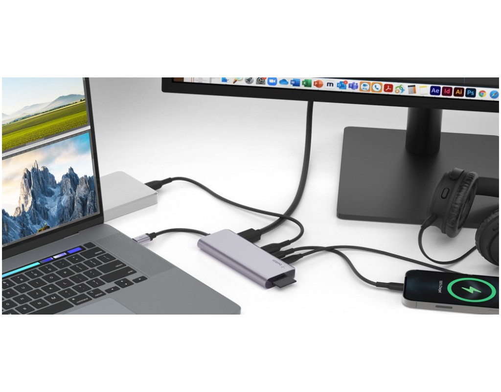 | Цей тонкий портативний адаптер USB-C дозволяє легко створити робочу станцію в будь-якому місці і спрощує переміщення між робочими місцями. Завдяки наскрізної зарядці до 100 Вт немає необхідності вибирати між розширенням порту і потужністю. |