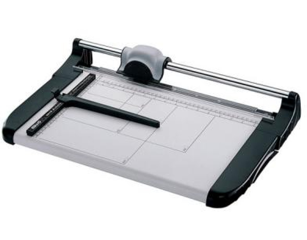| Тример KW-Trio KW-Trio 3018 (22341) призначений для різання до 15 паперових листів щільністю 70г / м2 форматів до А4 (210х297мм) по довгій стороні, фотографій, заламінованих документів та ін. Особливості: безпечна ергономічна ріжуча головка; змінний самозагострювальний ніж і контрніж із загартованої сталі; форматна розмітка робочої поверхні; прозора притискна лінійка з автоматичним притиском під час різу; шкала в міліметрах дюймах; механізм парковки ножа; металевий корпус сріблясто-чорного кольору з протиковзкими ніжками. Застосовується як в офісах, так і в малій поліграфії для середніх об'ємів робіт із стандартними форматами паперу. Одна з найпопулярніших моделей різаків, що володіє максимальною кількістю функцій і прекрасним поєднанням "ціна / якість". |