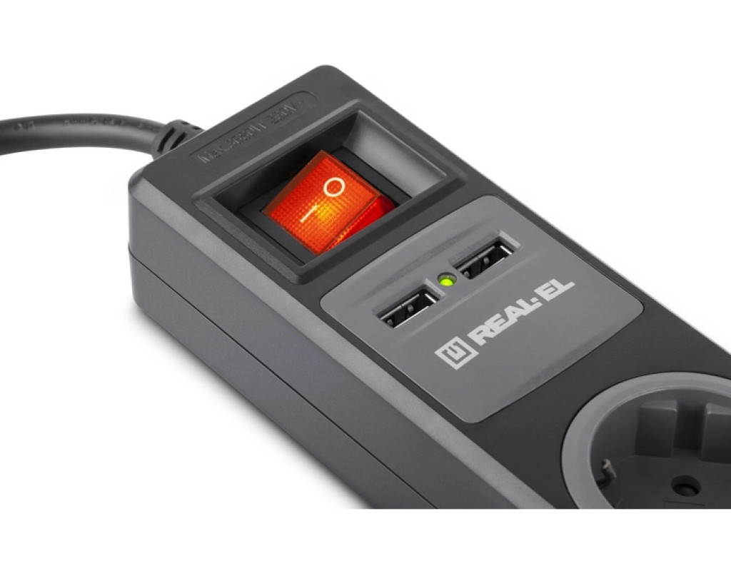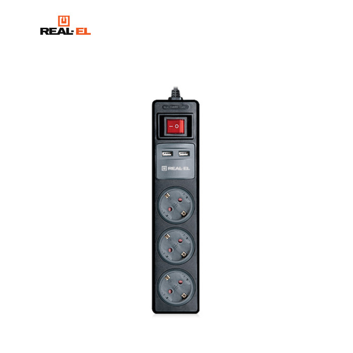 REAL-EL RS-3 USB CHARGE 1.8m, black (EL122500001) являє собою зручний і надійний мережевий подовжувач довжиною 1,8 метри з вбудованим USB зарядним пристроєм призначений для підключення до електричної мережі електроприладів і одночасної зарядки двох пристроїв. Має 3 розетки із заземленням і захисними шторками і 2 USB-порти для зарядки. Основні характеристики: