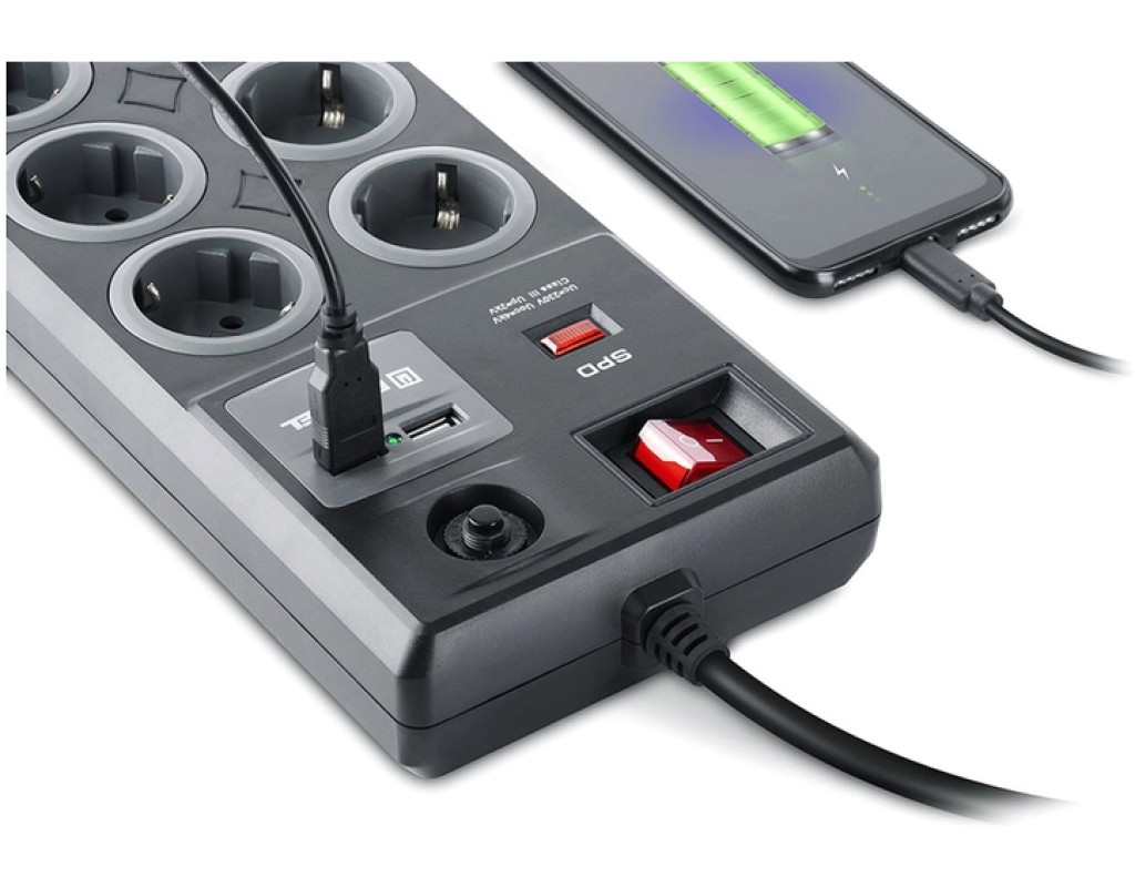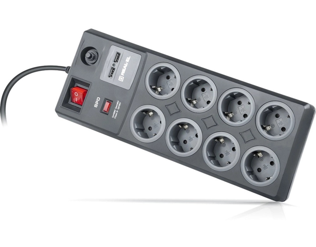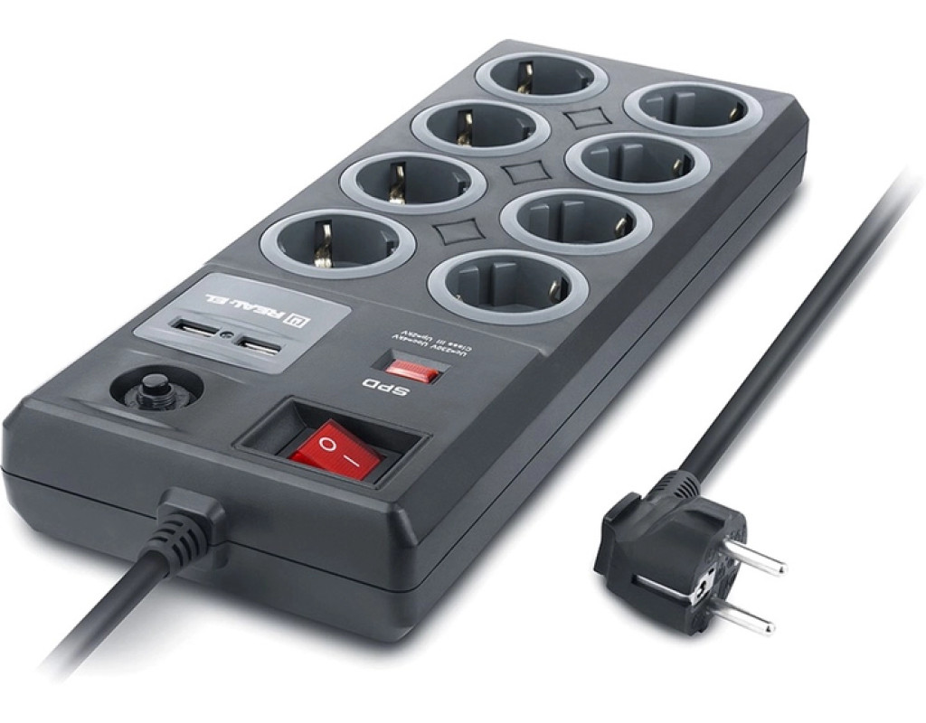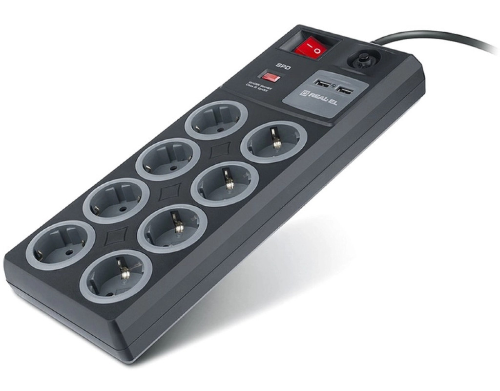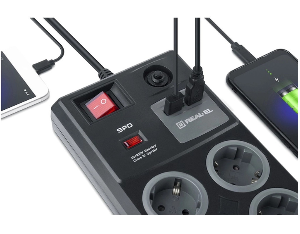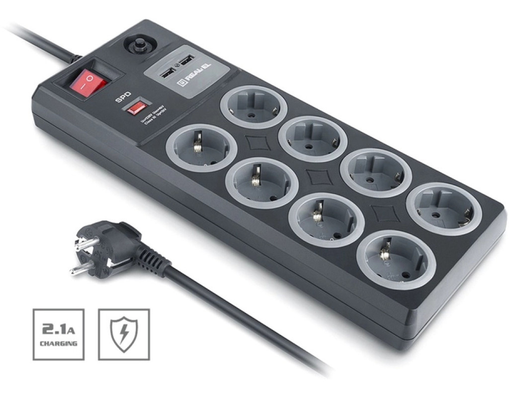 Мережевий фільтр-подовжувач REAL-EL RS-8F USB Charge із вбудованим USB зарядним пристроєм призначений для підключення до електричної мережі електроприладів та забезпечення їх захисту від високовольтних імпульсів напруги та постійної фільтрації високочастотних перешкод. Особливості: - Вбудований захист від грозових розрядів (блискавкозахист)