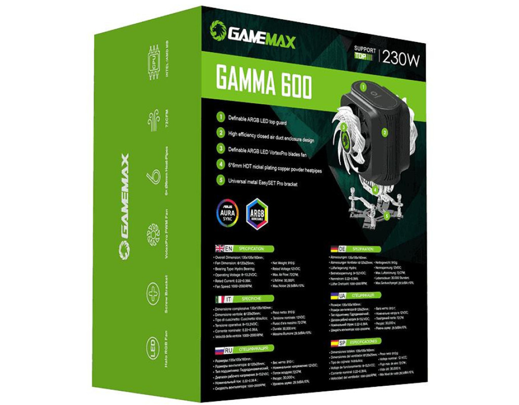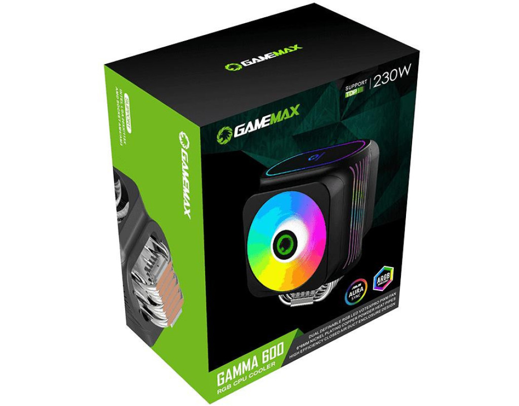 Gamemax GAMMA 600 - відмінний кулер для продуктивного процесора. Має різнокольорову RGB-підсвітку (з 10-ма режимами освітлення) вентилятора, тому виглядає яскраво та стильно доповнить геймерський ПК. Оснащений алюмінієвою основою, який сприяє кращому охолодженню компонента. Використовується конструкція лопатей SilentPro для підвищення ефективності конвекції повітря. Підходить майже на всі сокети. Швидкість обертання кулера складає 1000-2000 об / хв. Нікельовані мідні теплові трубки покращують відведення тепла. Теплова трубка знаходиться в прямому контакті з процесором, що забезпечує ефективну і швидку передачу тепла для максимального відведення тепла. |