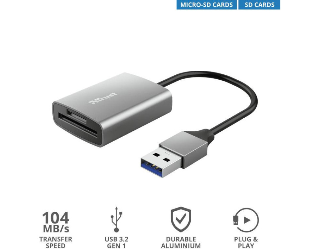 | Компактнсть для подорожей Якщо ви фотограф або відеооператор, який завжди в русі, щоб зробити ідеальний знімок або фільм, ви знаєте, що не хочете тягати з собою велику обладнання. Пристрій читання карт Trust Dalyx Fast USB 3.0 стане вашим незамінним помічником при резервному копіюванні зображень під час поїздок. Це швидкоDalyx використовує швидке з'єднання USB 3.2 (Gen 1) типу A, що дозволяє швидко створювати резервні копії своєї роботи і продовжувати зйомку. Сумісні карти UHS-I дозволяють копіювати дані зі швидкістю до 104 МБ/с. Швидко закріпіть свою важку працю і продовжуйте займатися тим, що любите найбільше: створювати приголомшливі візуальні ефекти. Маленький і сильнийВи завжди візьмете з собою Trust Dalyx. Він настільки малий, що ви навіть не помітите його в сумці, а литий під тиском алюмінієвий корпус захищає кард-рідер від небезпек зовнішнього світу. Він поставляється з коротким USB-кабелем, який позбавить вашу сумку і стіл від безладу, а оскільки він працює як з SD, так і з micro SD картами, Trust Dalyx стане ідеальним компаньйоном для будь-якого фотографа, документаліста або ентузіаста екстремальних видів спорту. |